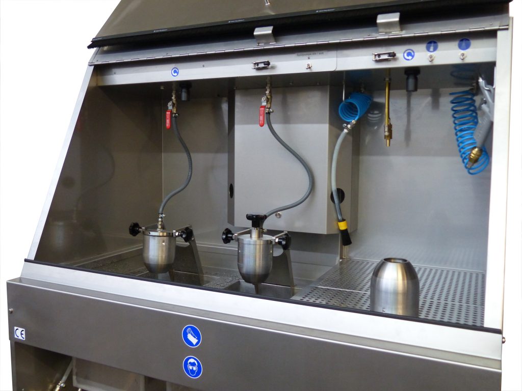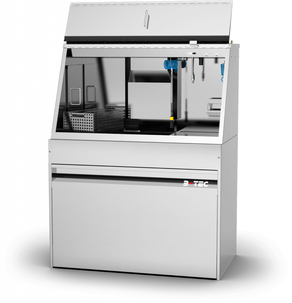 The directional air chambers are automatically rinsed with cleaning fluid from the inside. A tilting device allows the cleaning status of the holes to be checked. The manual cleaning station offers the possibility of manual pre- and/or post-cleaning.