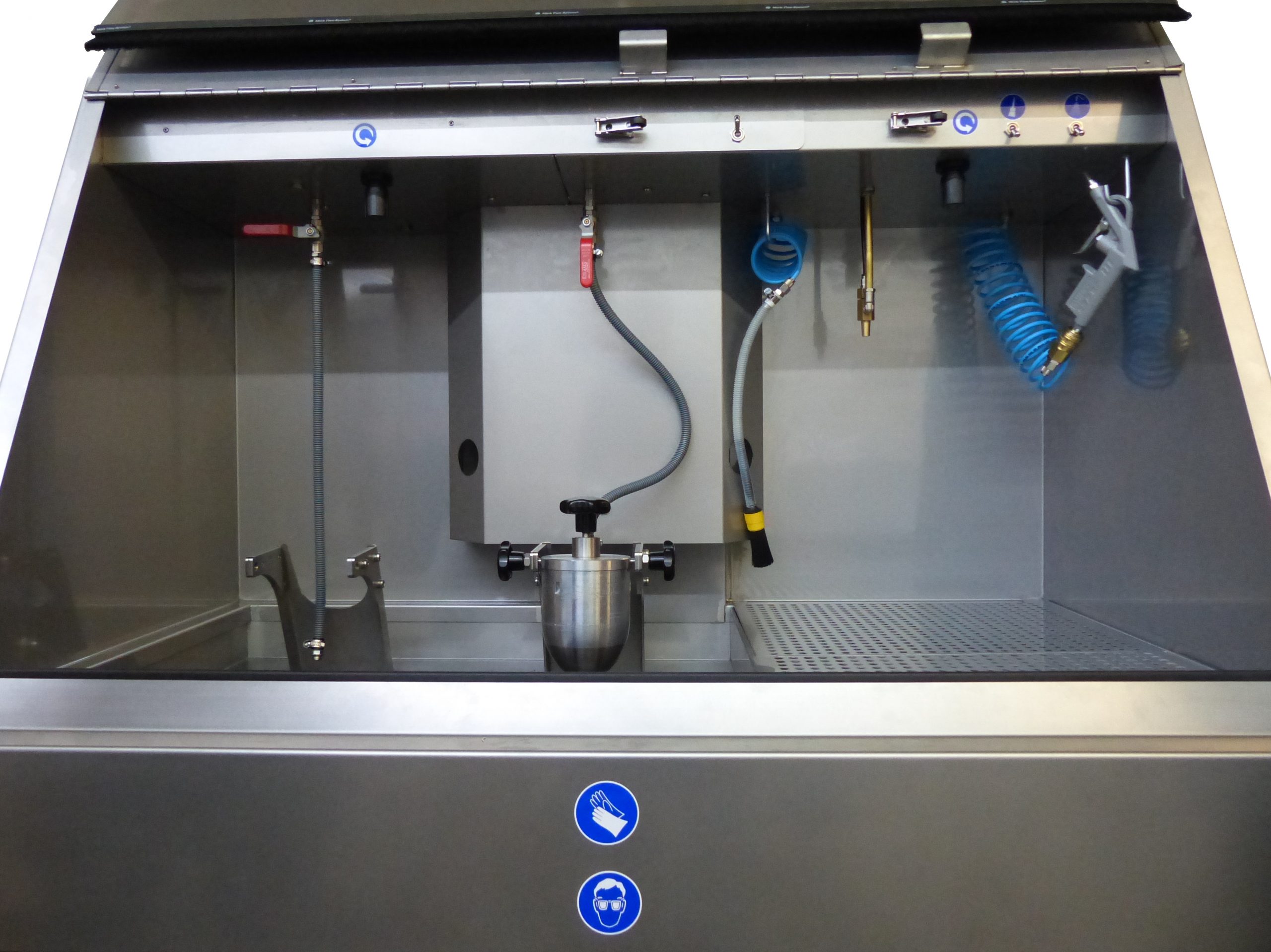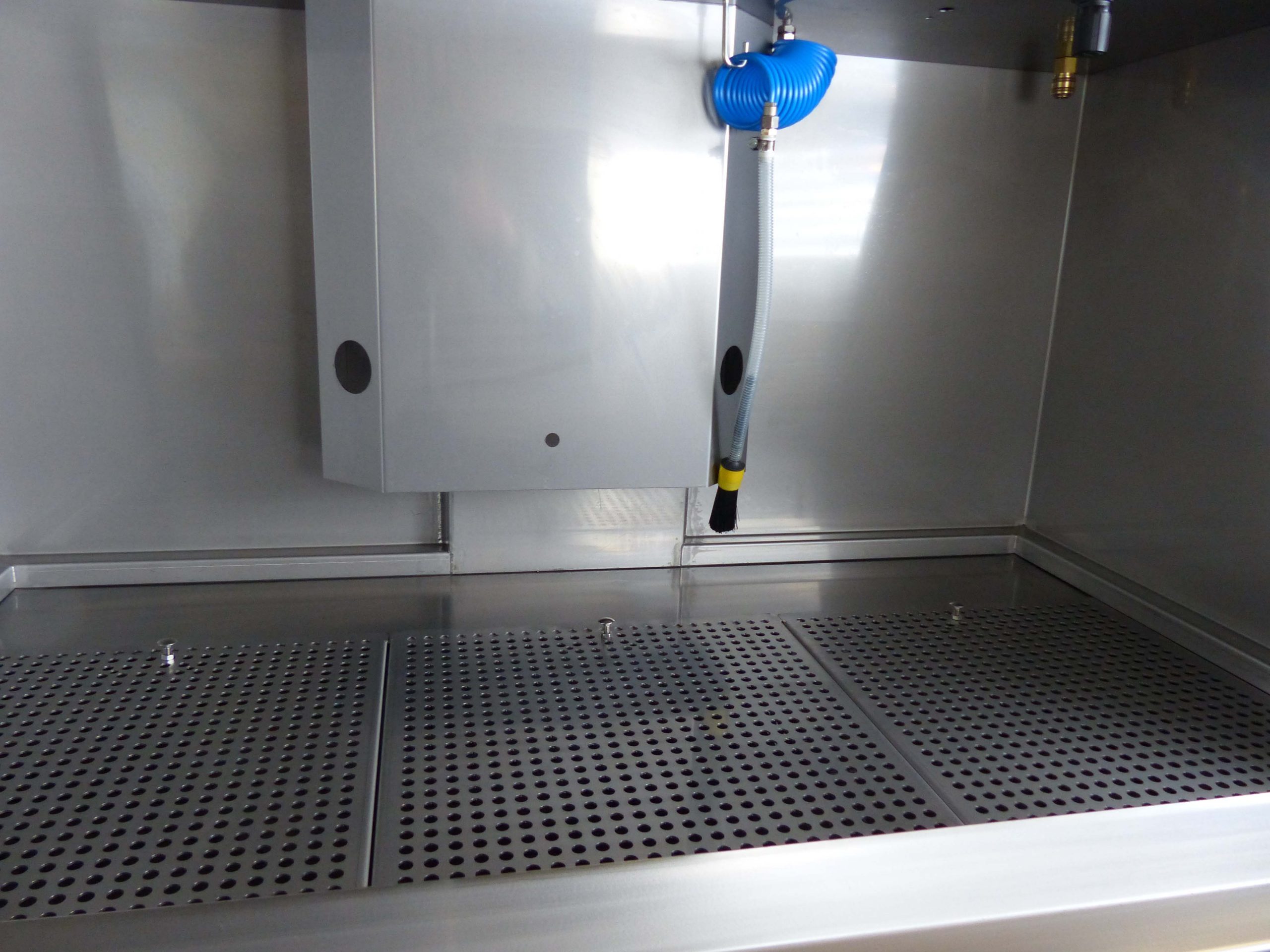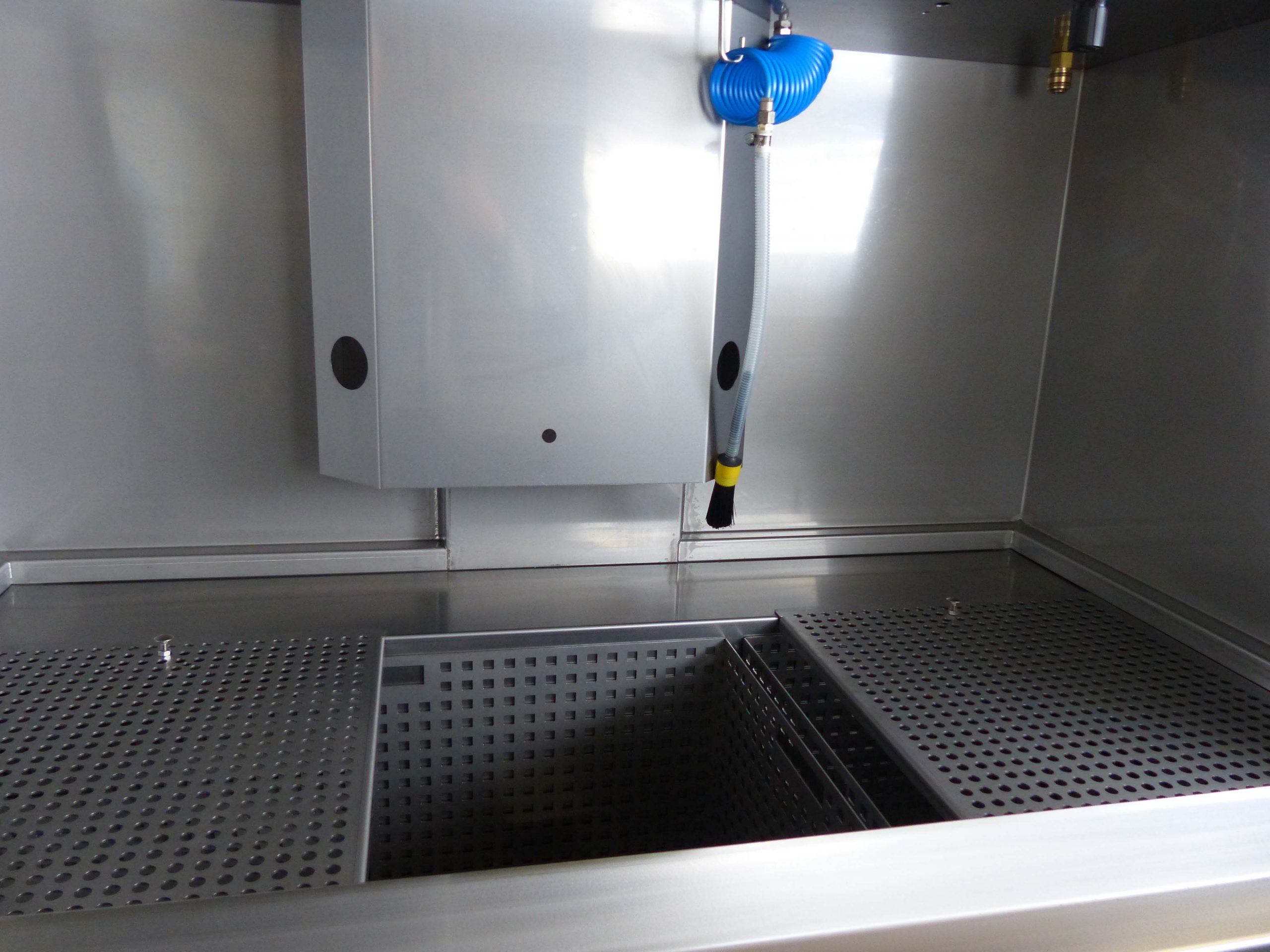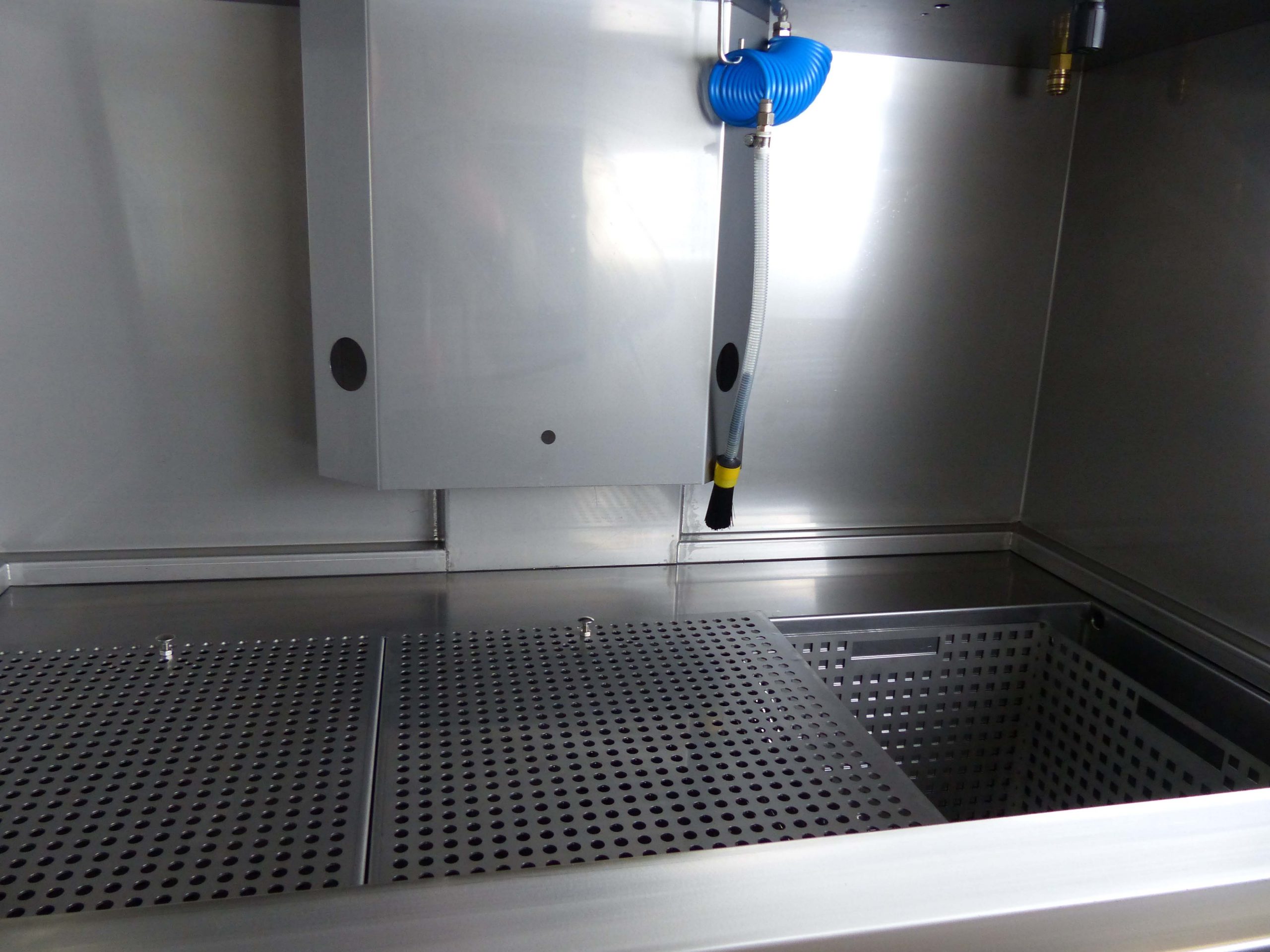 The directional air chambers are automatically rinsed with cleaning fluid from the inside. A tilting device allows the cleaning status of the holes to be checked. The manual cleaning station offers the possibility of manual pre- and/or post-cleaning.