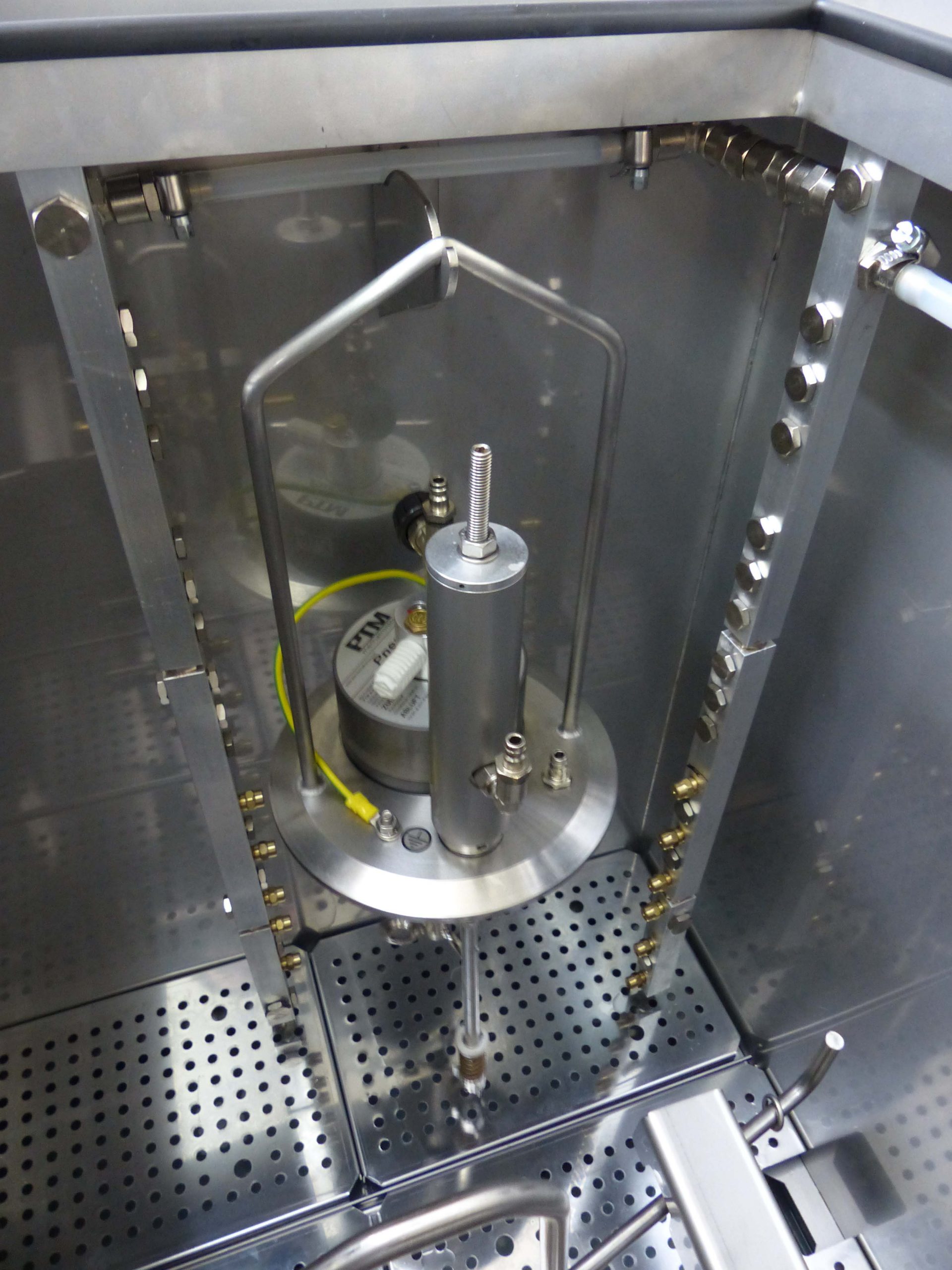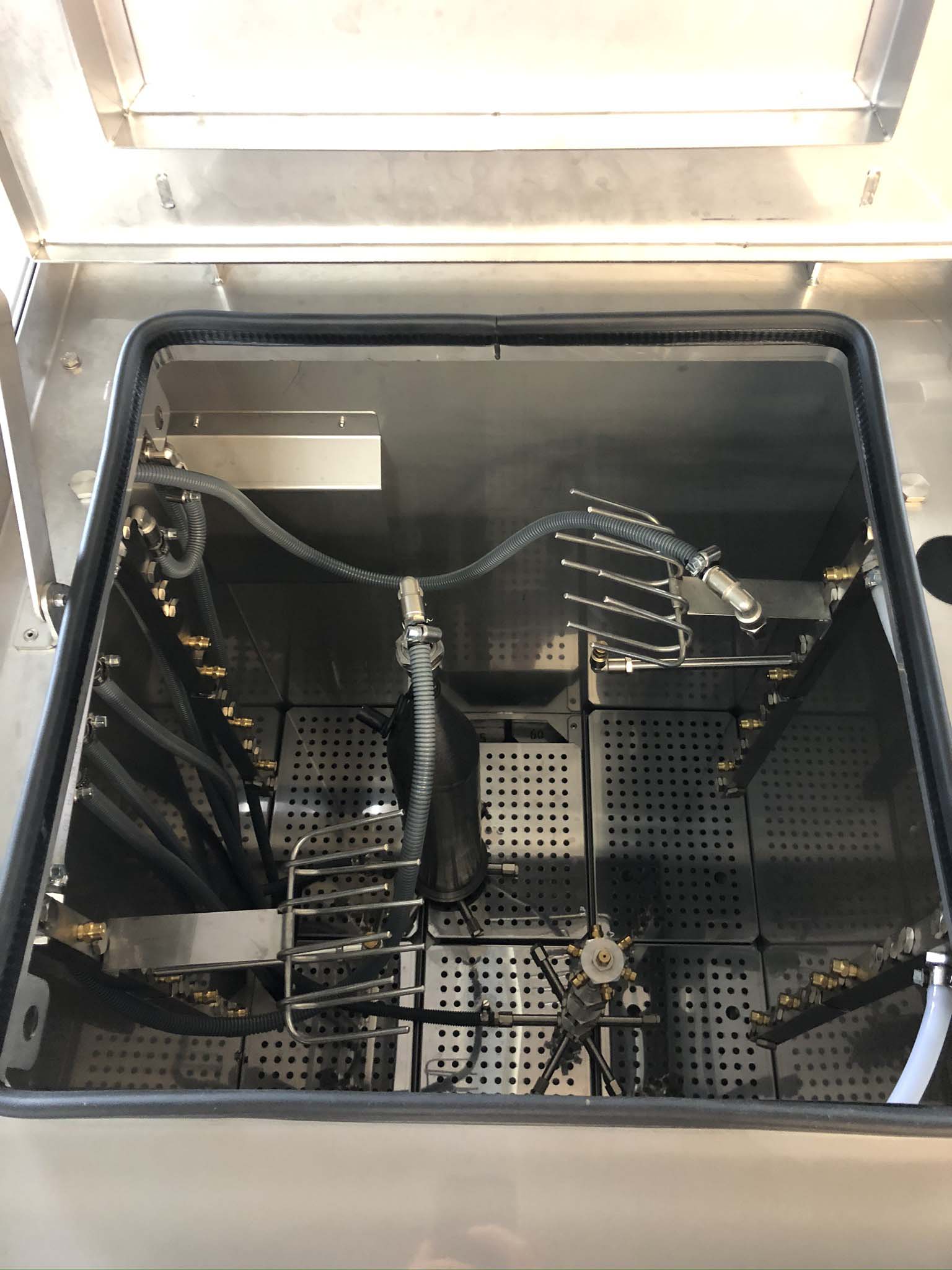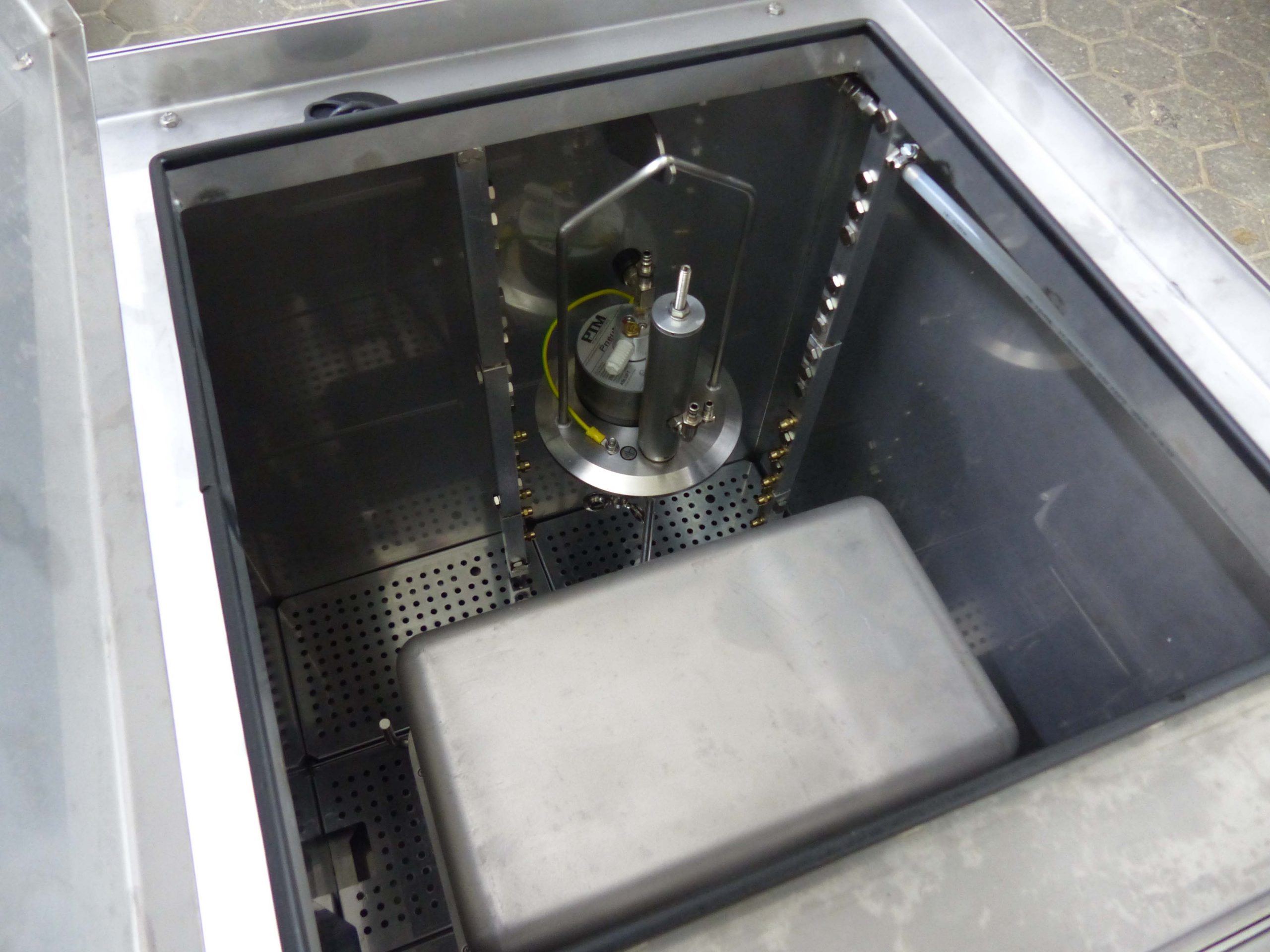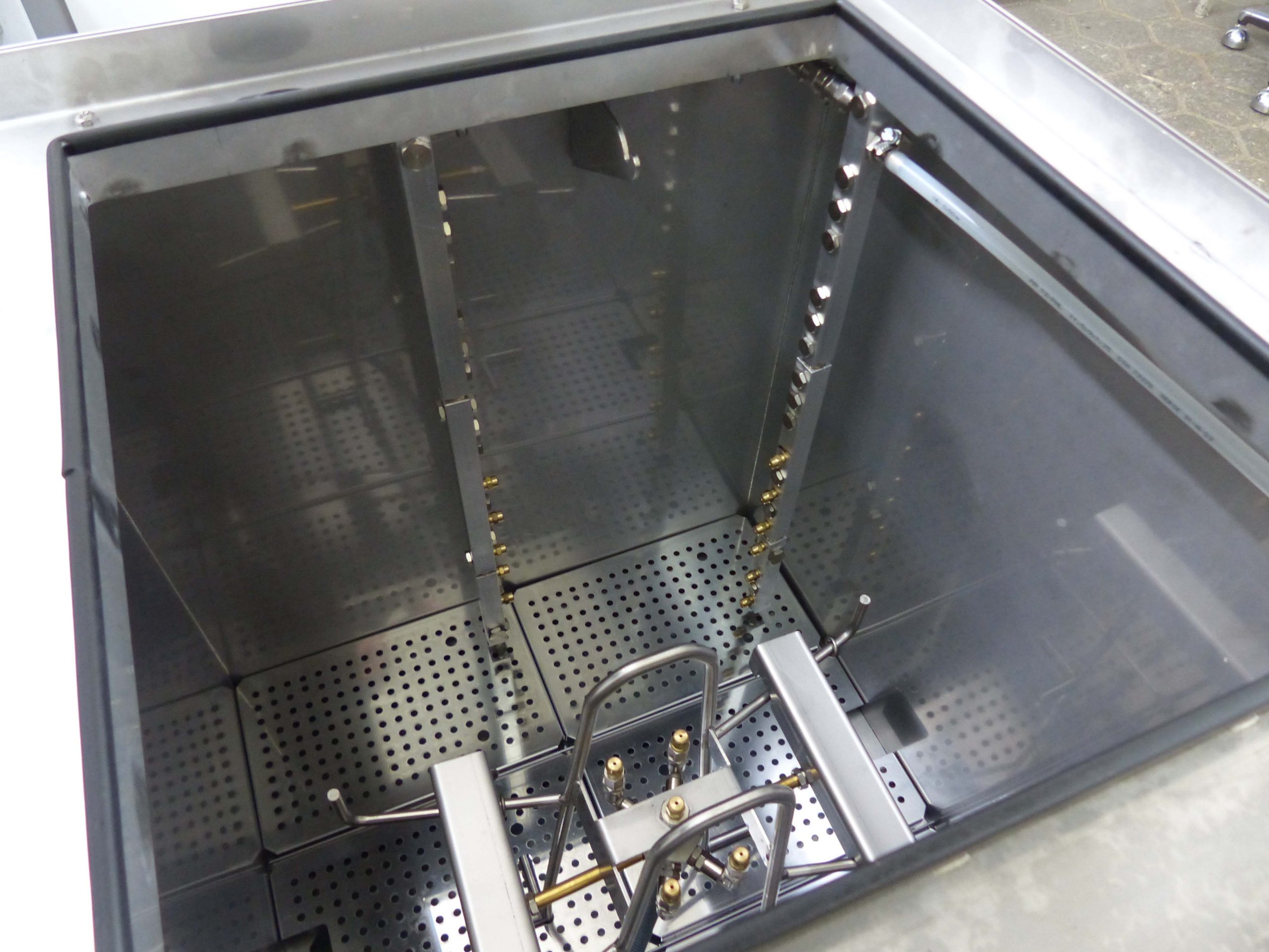 The directional air chambers are automatically rinsed with cleaning fluid from the inside. A tilting device allows the cleaning status of the holes to be checked. The manual cleaning station offers the possibility of manual pre- and/or post-cleaning.