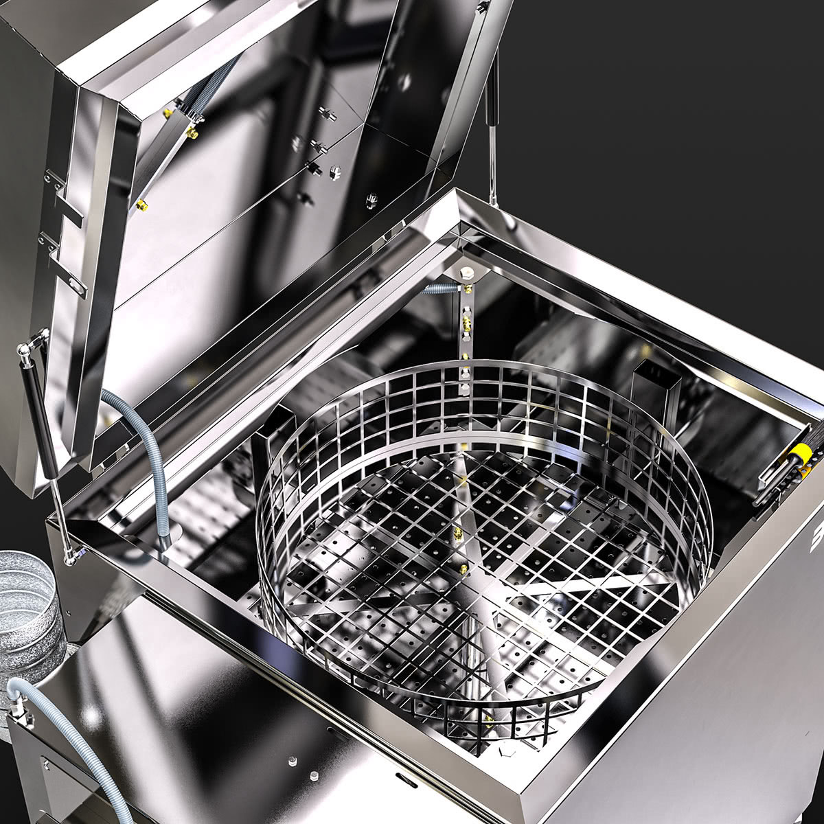 With its pneumatically driven rotating basket, CleanTwist can automatically clean (several) (paint-) polluted parts and components up to a size of 590 mm (simultaneously).