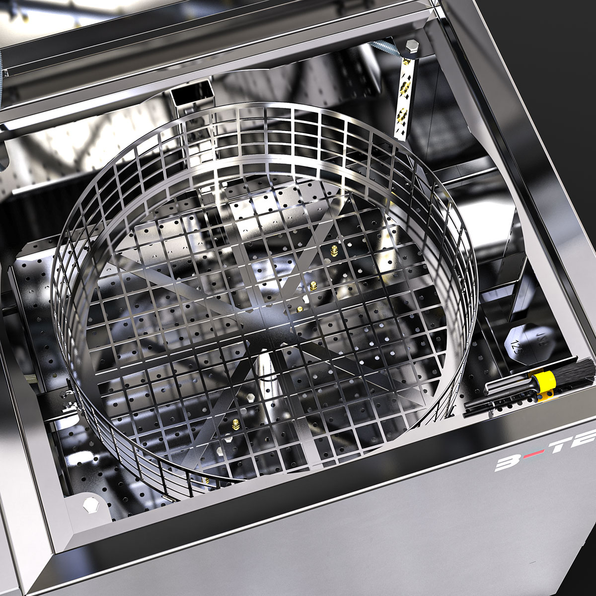 Compared to static parts cleaning systems (without rotating basket), the rotating basket ensures that each area of the part to be cleaned is evenly wetted with cleaning fluid to achieve a 100% consistent cleaning result.