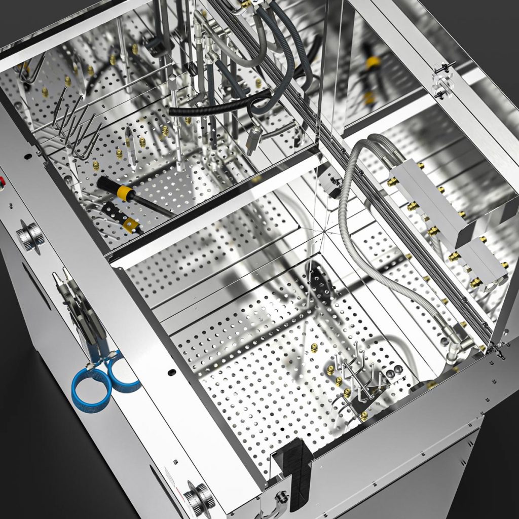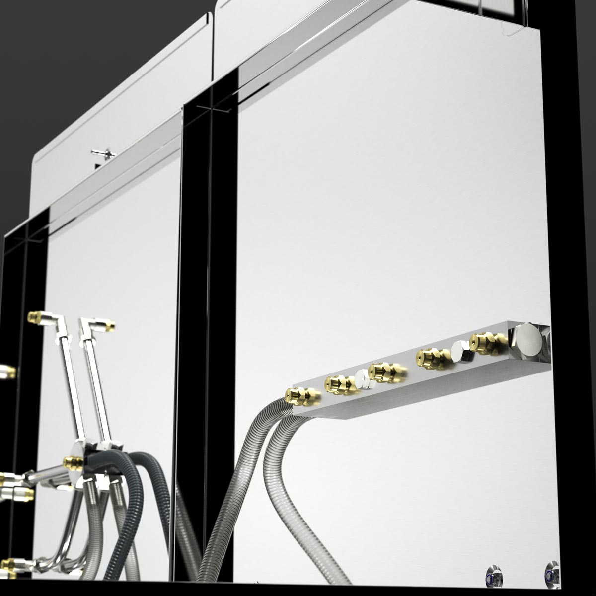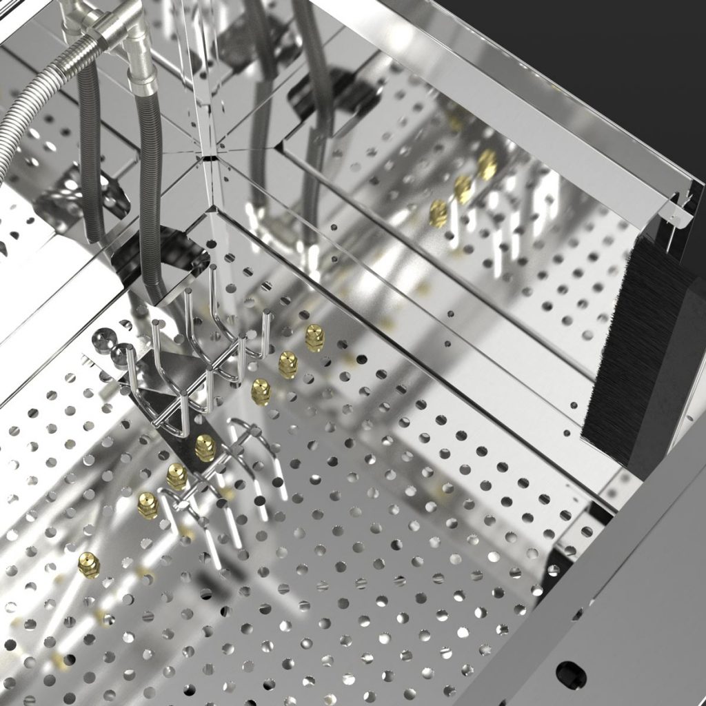 On the left-hand side of the washer, the gravity gun is cleaned automatically by a timer and 10 spray nozzles.