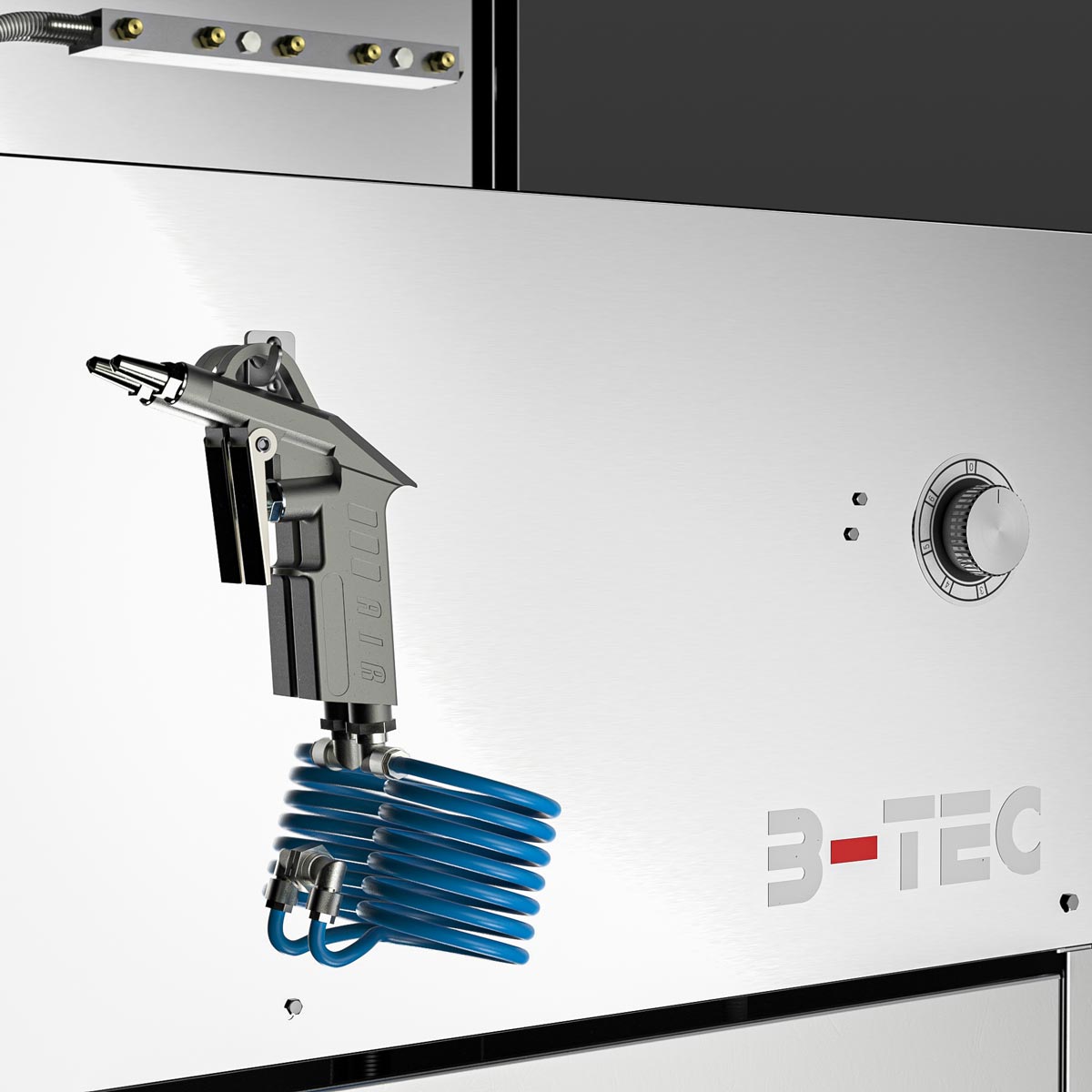 Certainly equipped with the B-TEC air flow system, the air channel of the spray gun is perfectly protected during automatic cleaning and contamination behind the air cap is prevented. The air cap does not need to be removed – less mechanical damage to paint and spray guns and high time savings.
