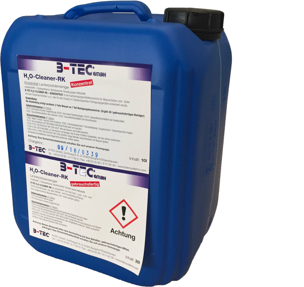 - Cleaner shipped as concentrate: 10 L concentrate + 20 L water = 30 L BTEC-H2O-Cleaner for up to 800-1000 spray gun cleaning cycles