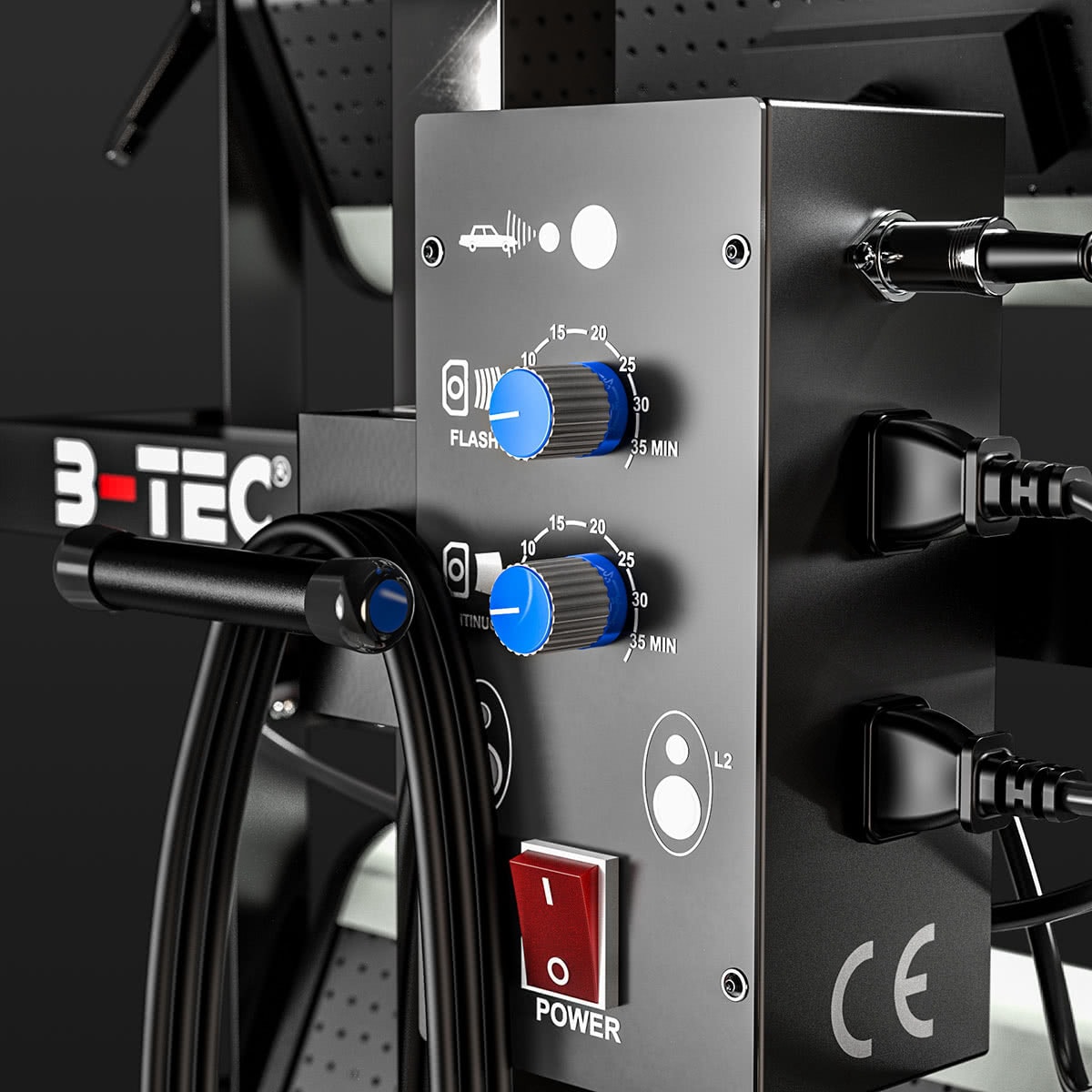 Like all B-TEC IR dryers (exceopt for IR-X), the IR-B02 also features 2-stage drying (flashlight / continuous drying) to heat the coating gently from the inside to the outside, thus preventing coating problems such as “boiling” and “biting”.