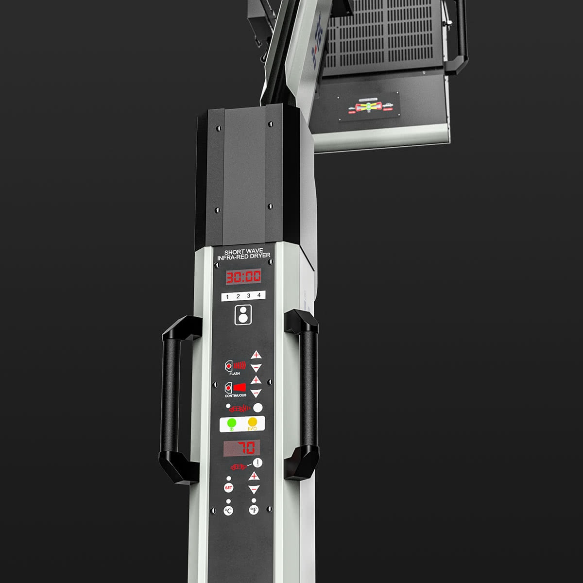 Like all B-TEC IR dryers (except IR-X), the IR-B03-Evolution also features 2-stage drying (flashlight / continuous drying) to heat the paint gently from the inside out, thus preventing paint problems such as “boiling” and “biting”.