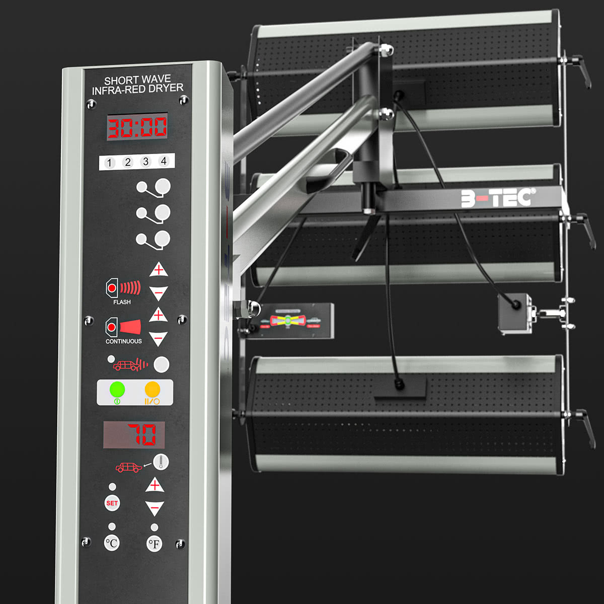 Like all B-TEC IR dryers (except for IR-X), the IR-B03 also features 2-stage drying (flashlight / continuous drying) to heat the coating gently from the inside to the outside, thus preventing coating problems such as “boiling” and “biting”.