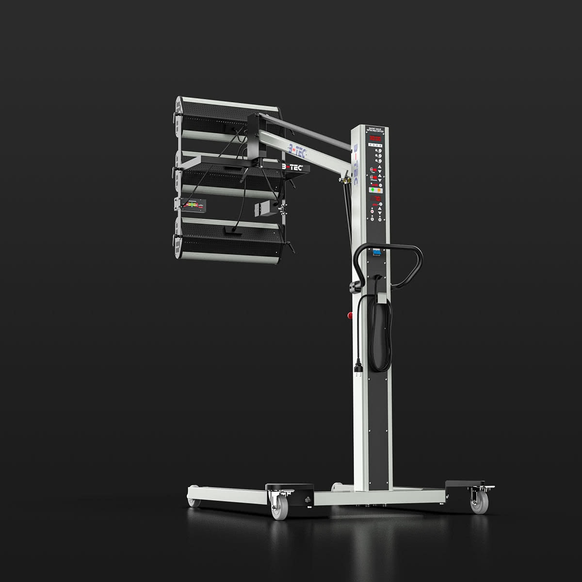 The short wave infrared dryer IR-B03/-T offers shortest drying times and high flexibility even for roof drying. With the only 10 cm high chassis, the dryer can be easily manoeuvred underneath lowered vehicles and thus enables the drying even of vehicle roofs.