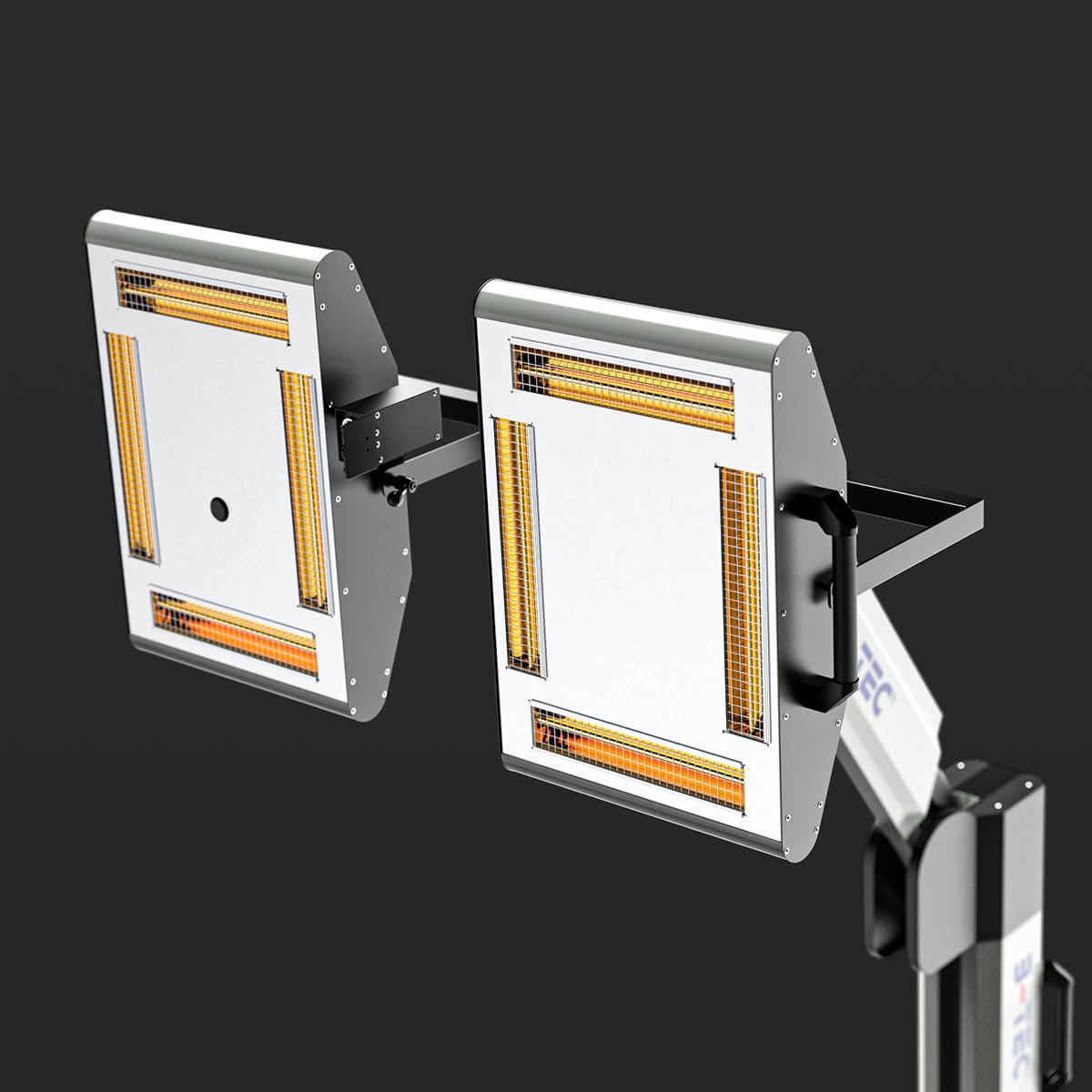 Short wave infrared dryer with 8 gold metallised emitters and reflectors also for drying large areas.
