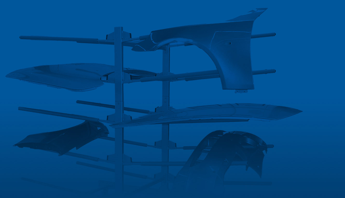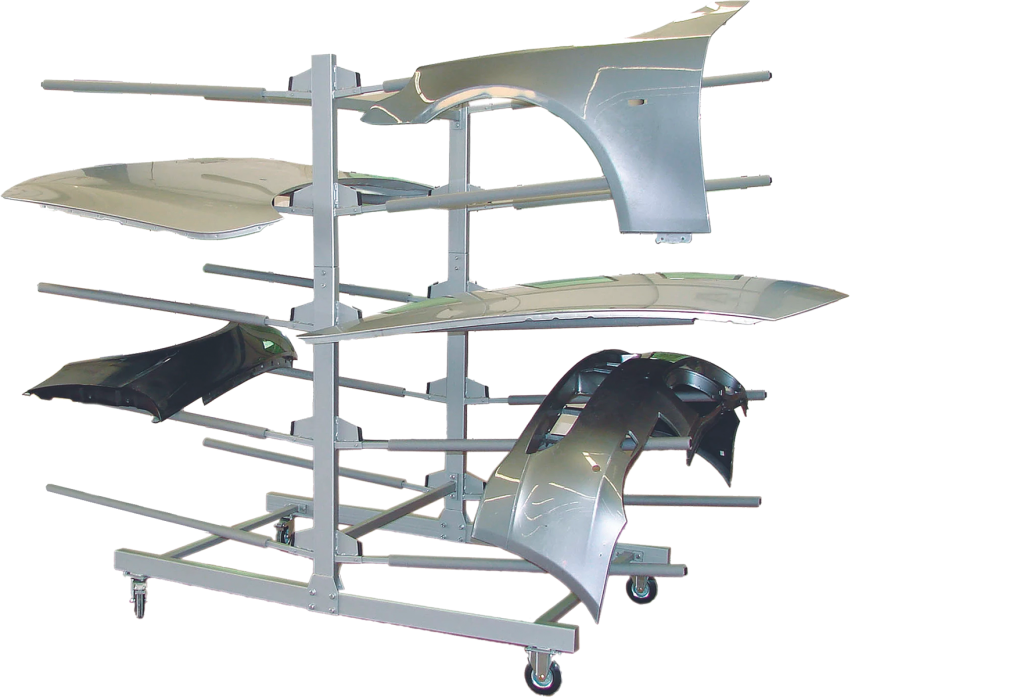Mobile storage system for up to 10 bonnets or 20 bumpers.