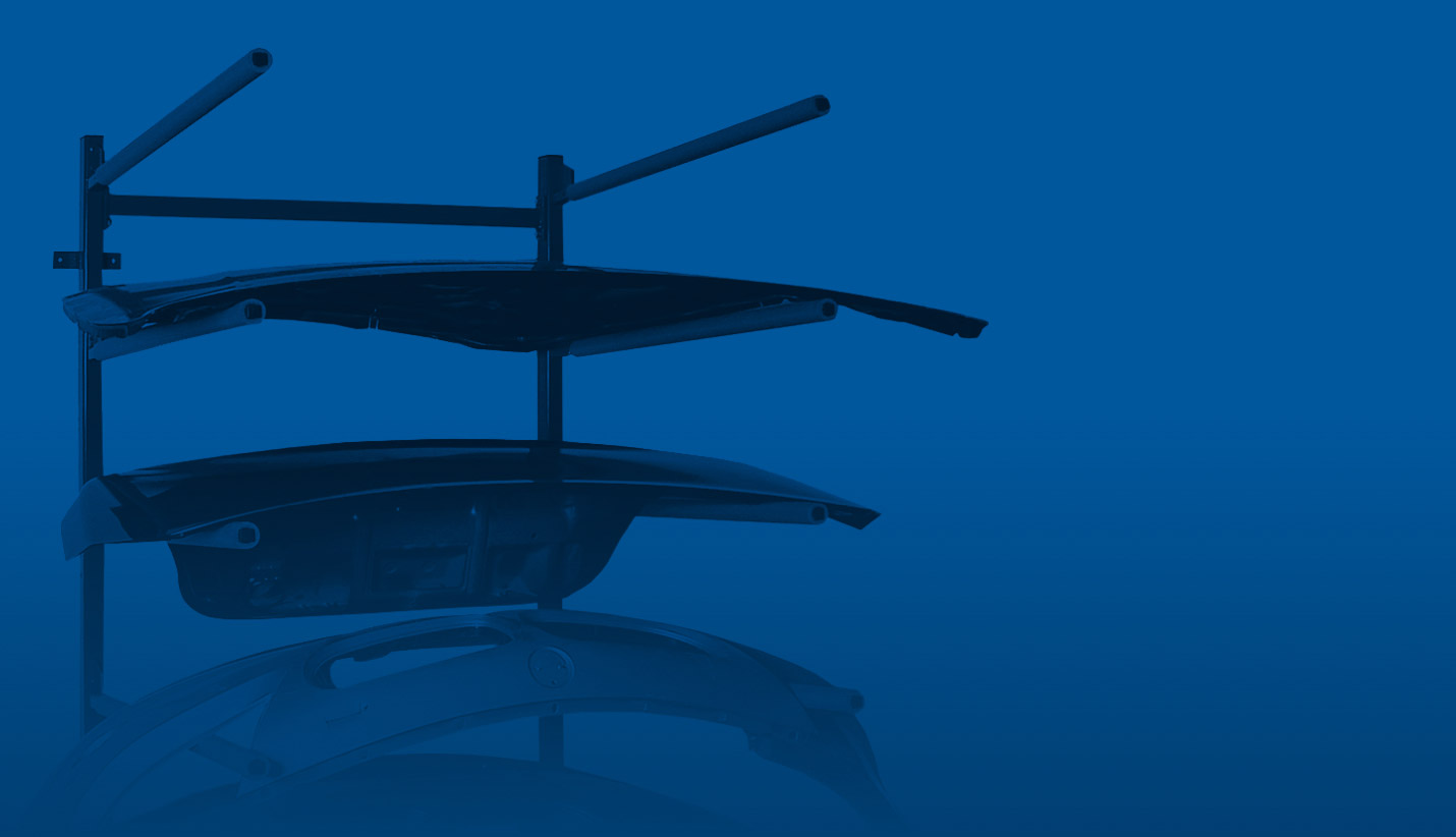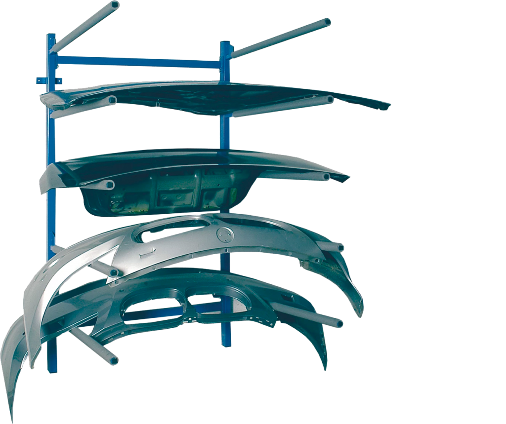 - space-saving storage system for up to 5 bonnets or 10 bumpers