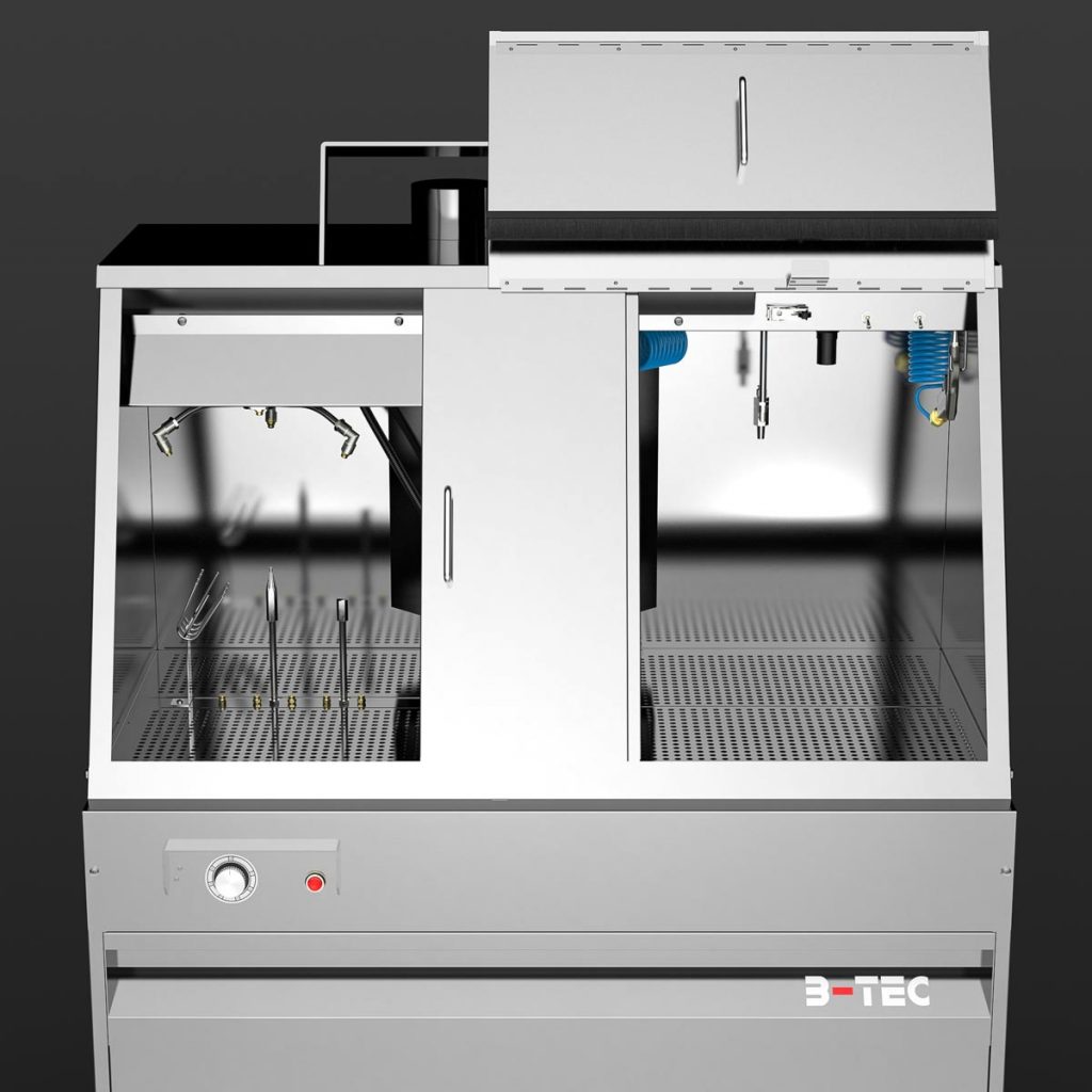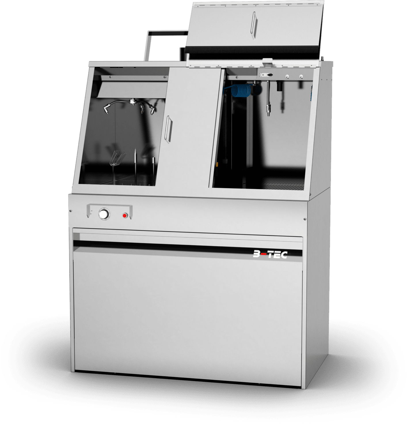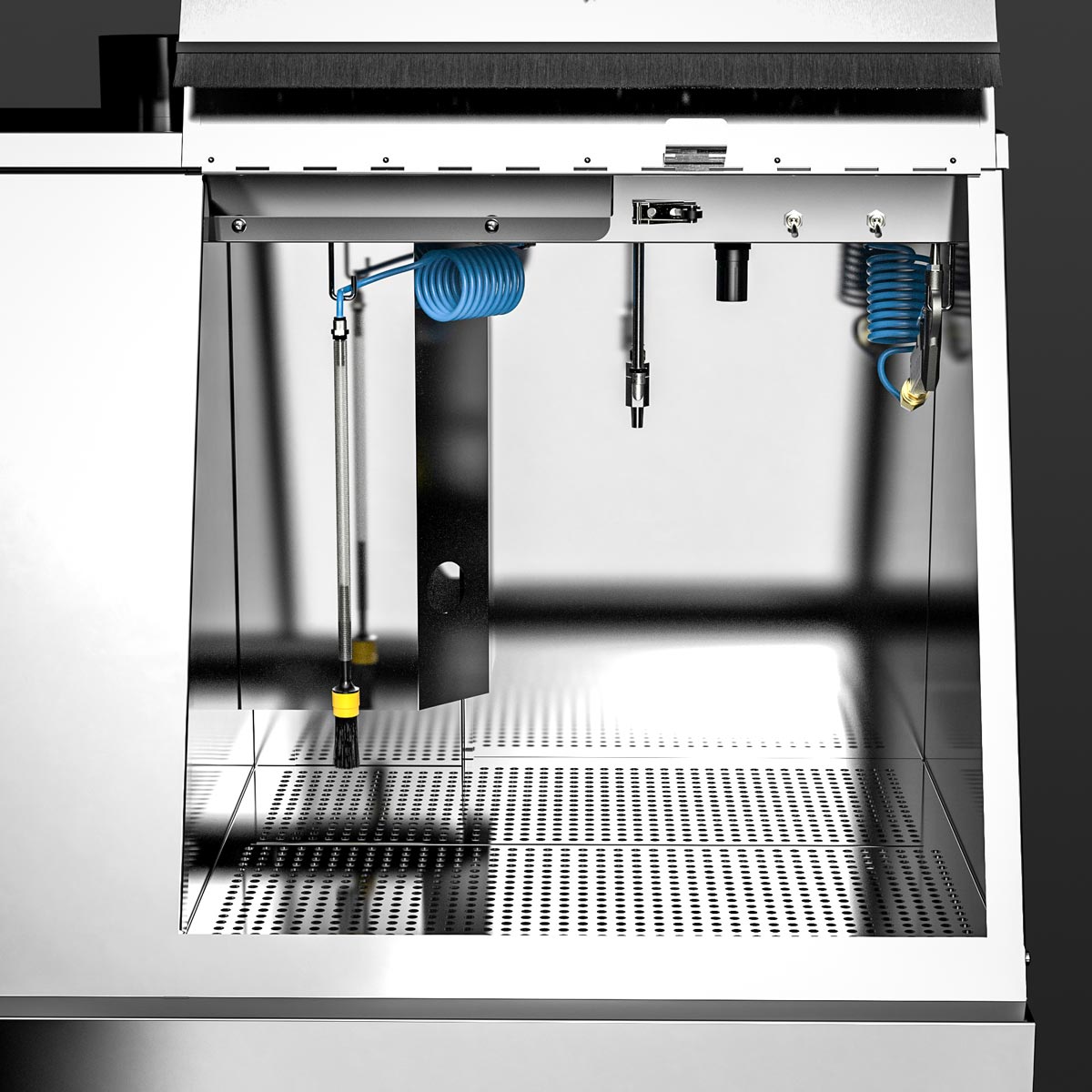 The manual cleaning area offers plenty of space, a pump-operated, pressure-adjustable brush, a fresh rinse nozzle for final cleaning and a blow-off gun for drying.
