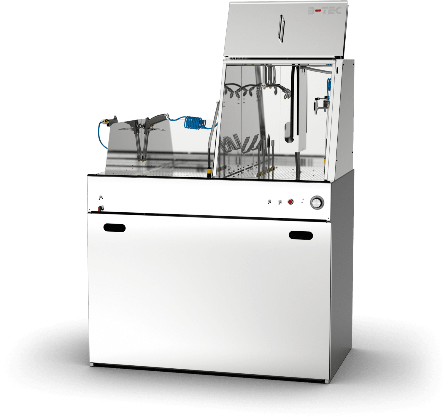 The left-hand side of the unit corresponds to the B-TEC w-800-1, a universal cleaning station for water-based paints with pneumatic mixing device (coagulation) for manual cleaning of parts or paint spray guns by using a brush and a water gun – perfect in combination with our B-TEC water-based paint cleaner H2O-RK.