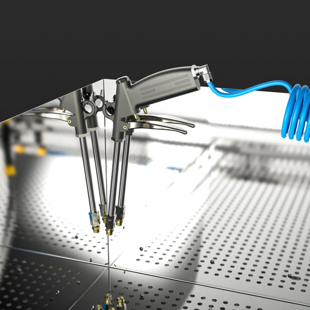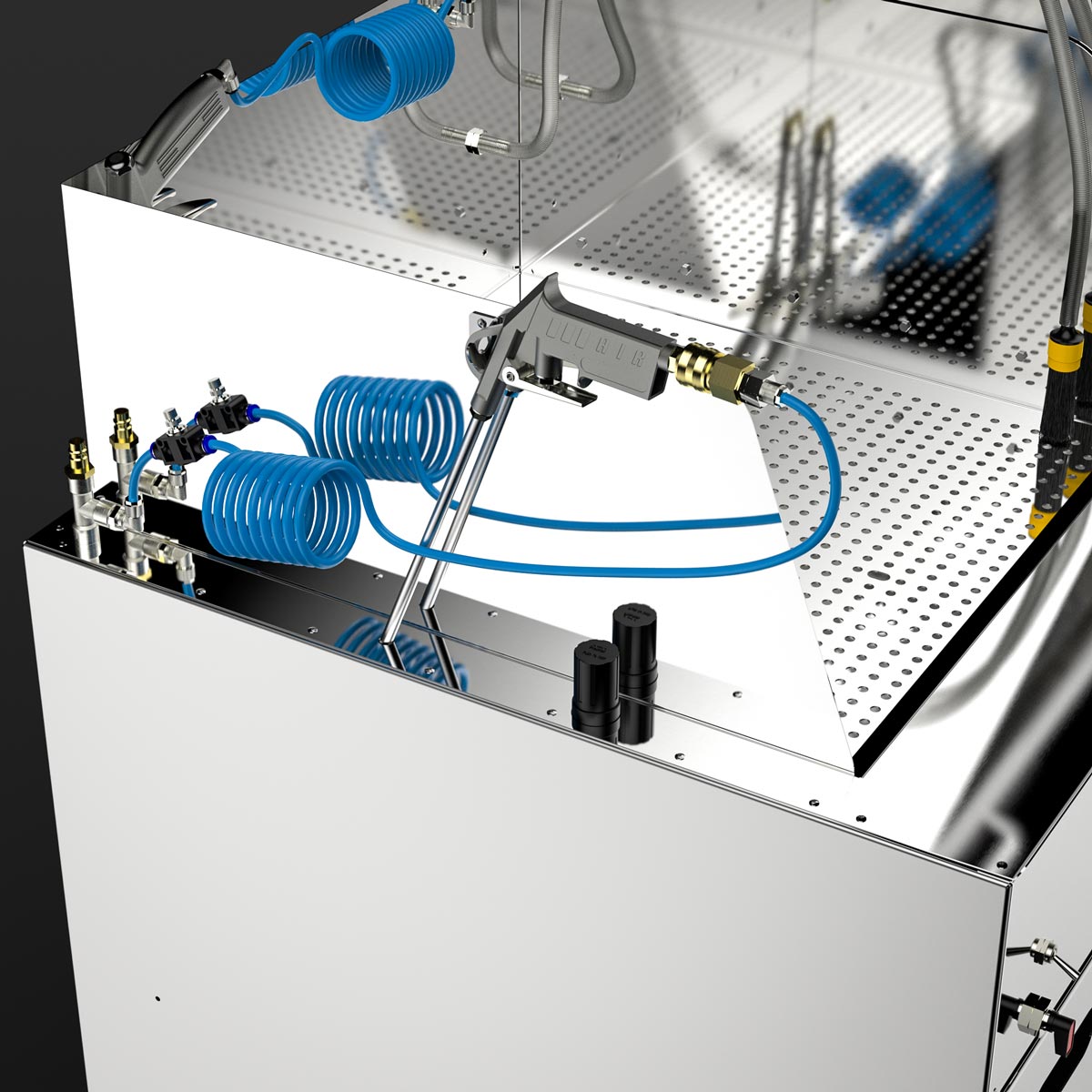Opening of the spray / paint guns by a trigger clamp takes place inside the gun washer after the gun sits perfectly on the cleaning nozzle.