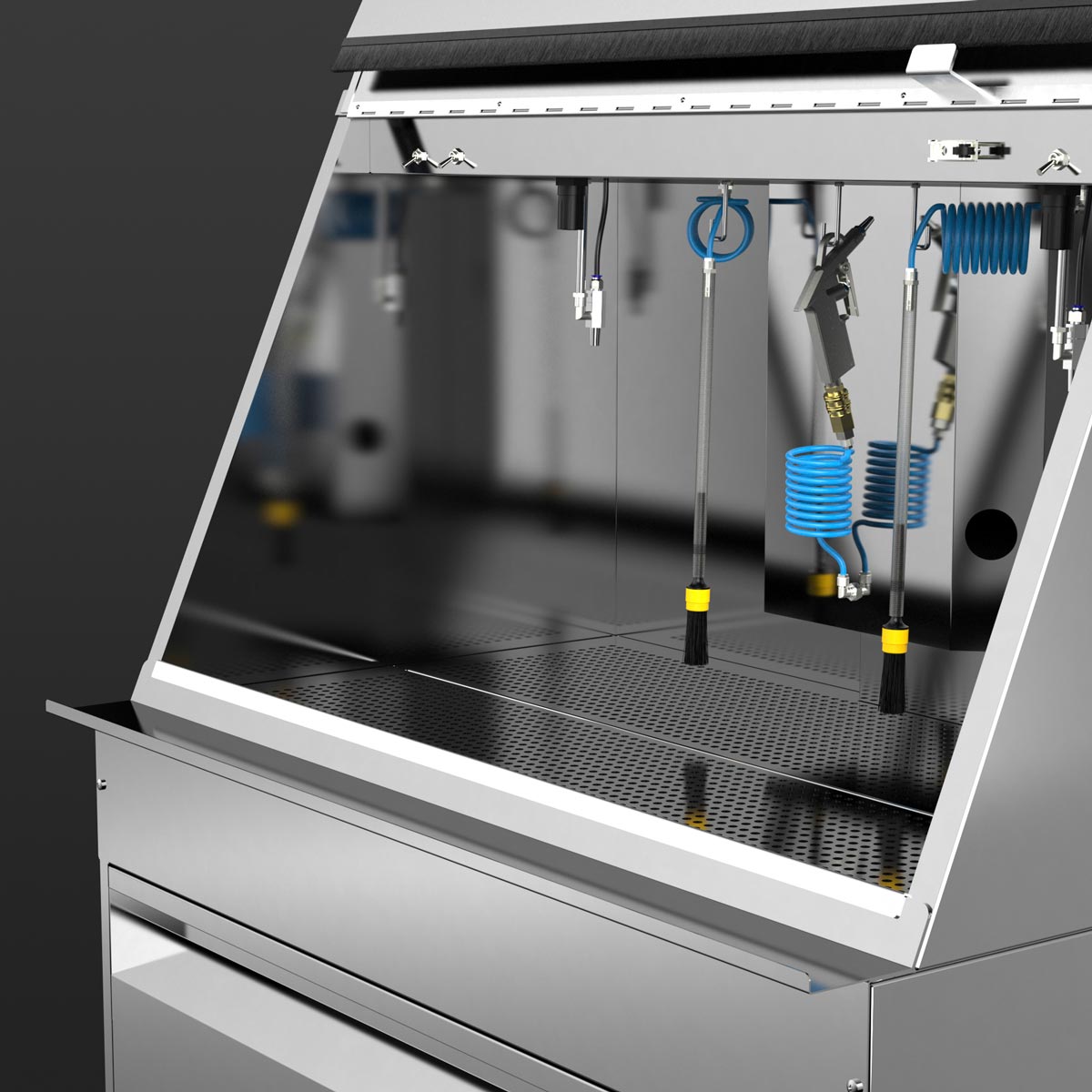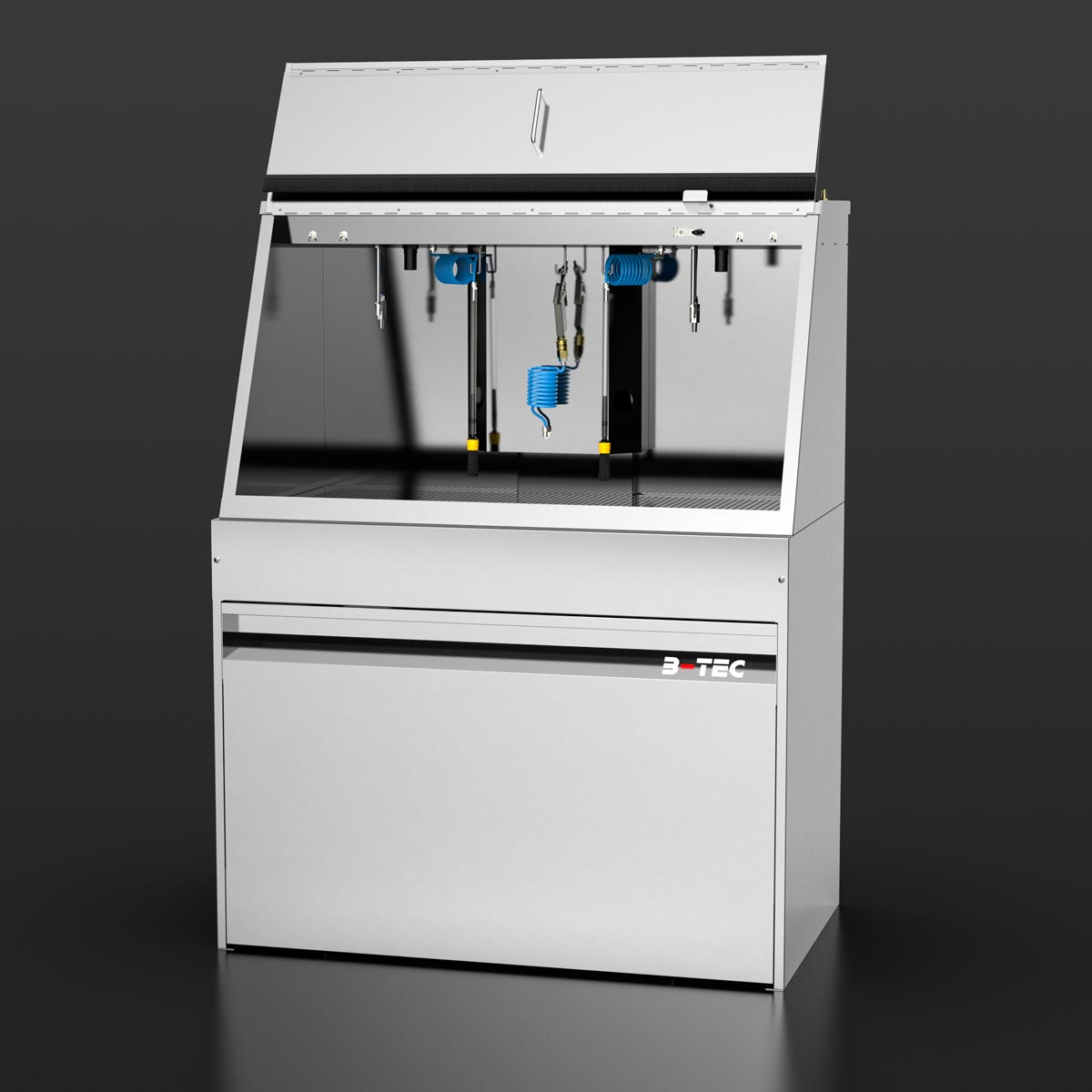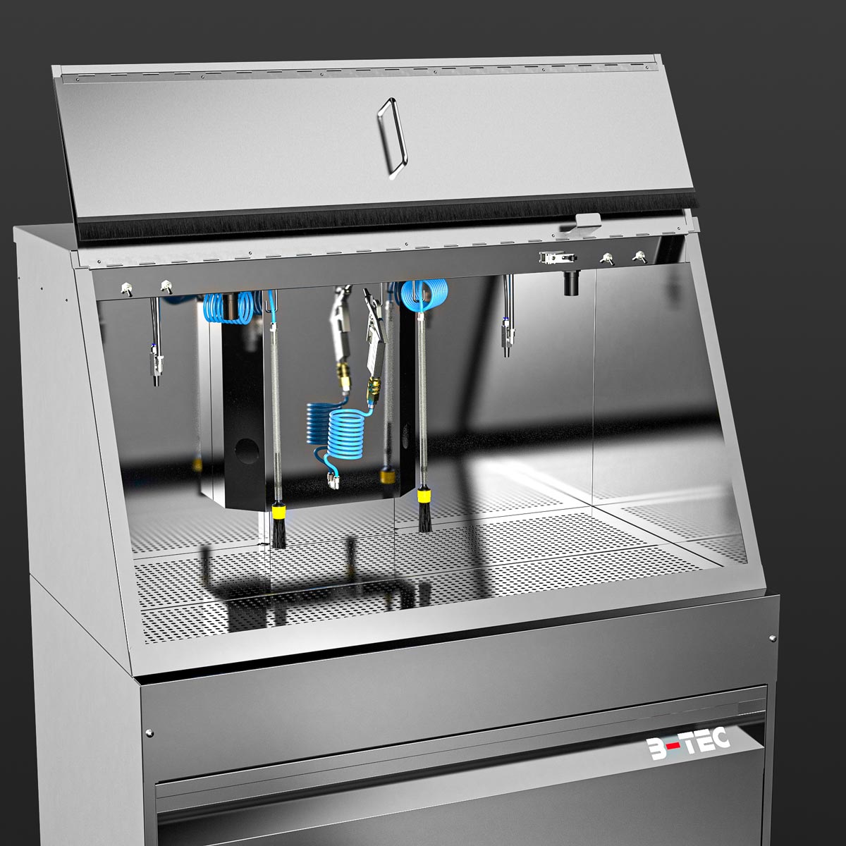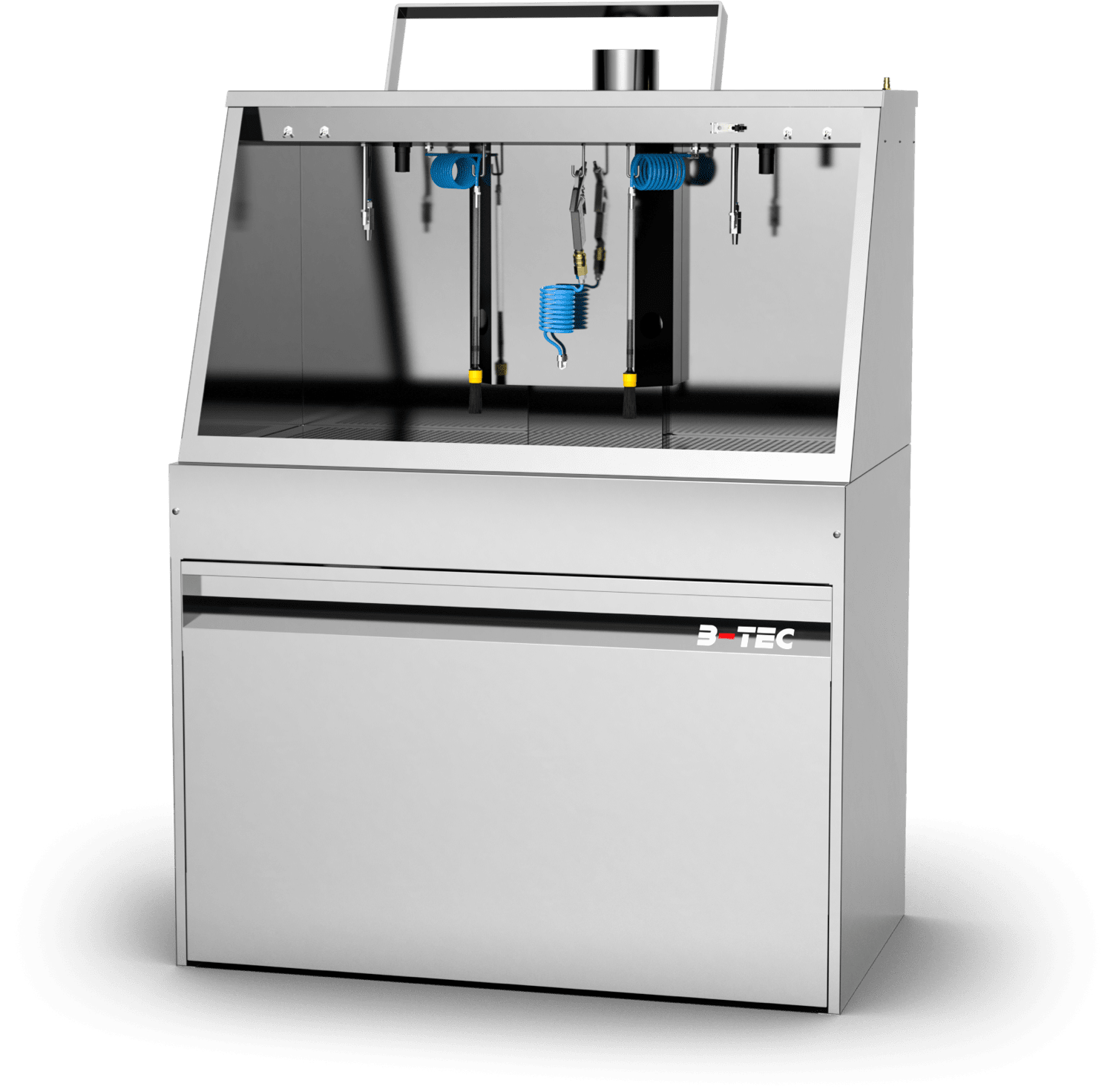 With a width of 1210 mm, it enables convenient, ergonomic cleaning of parts up to 1200 mm and effectively protects the user from solvent vapours with the powerful B-TEC air extraction system.