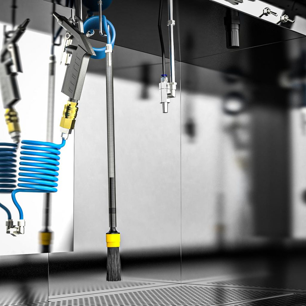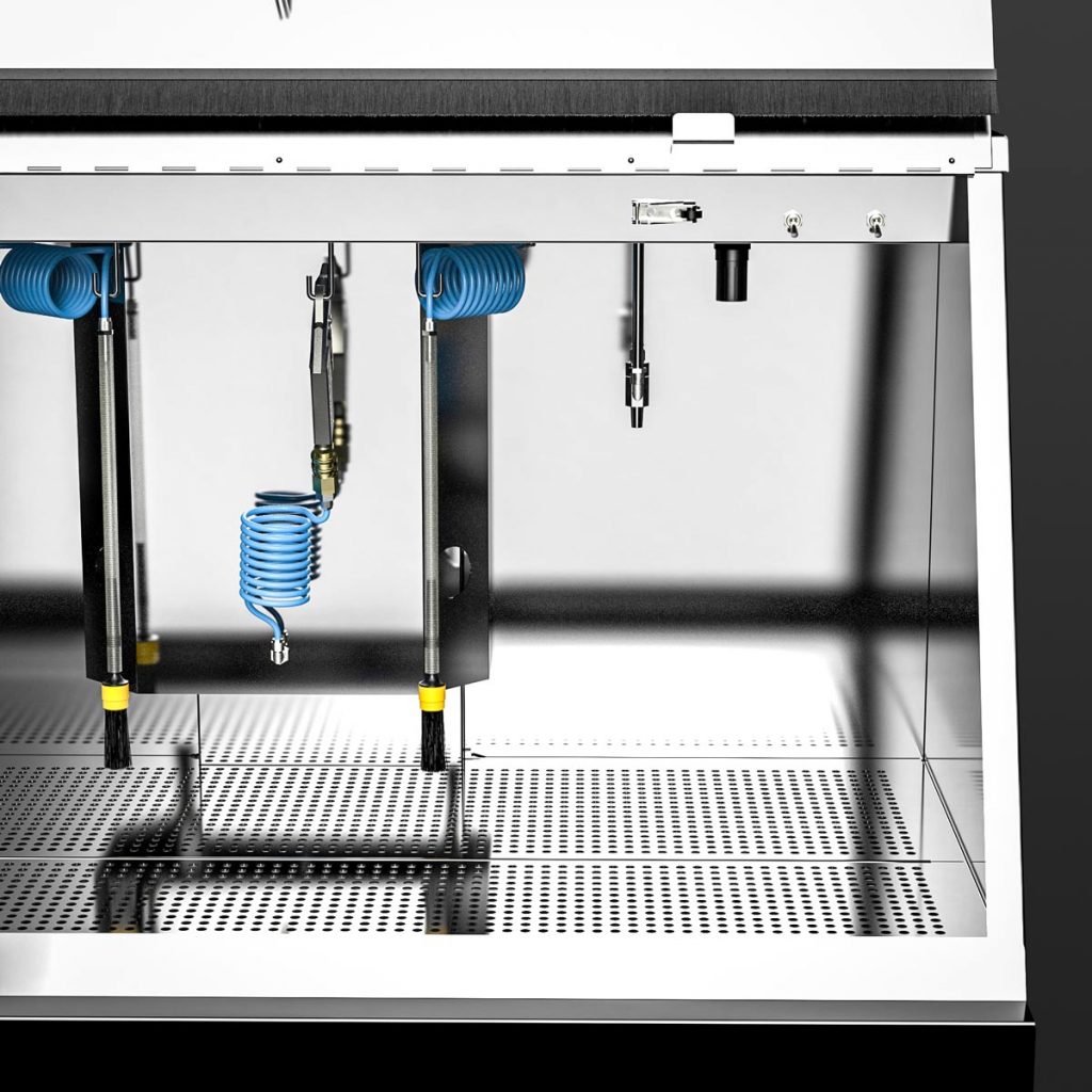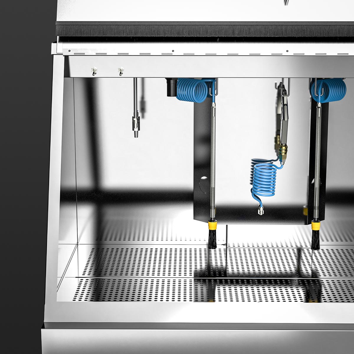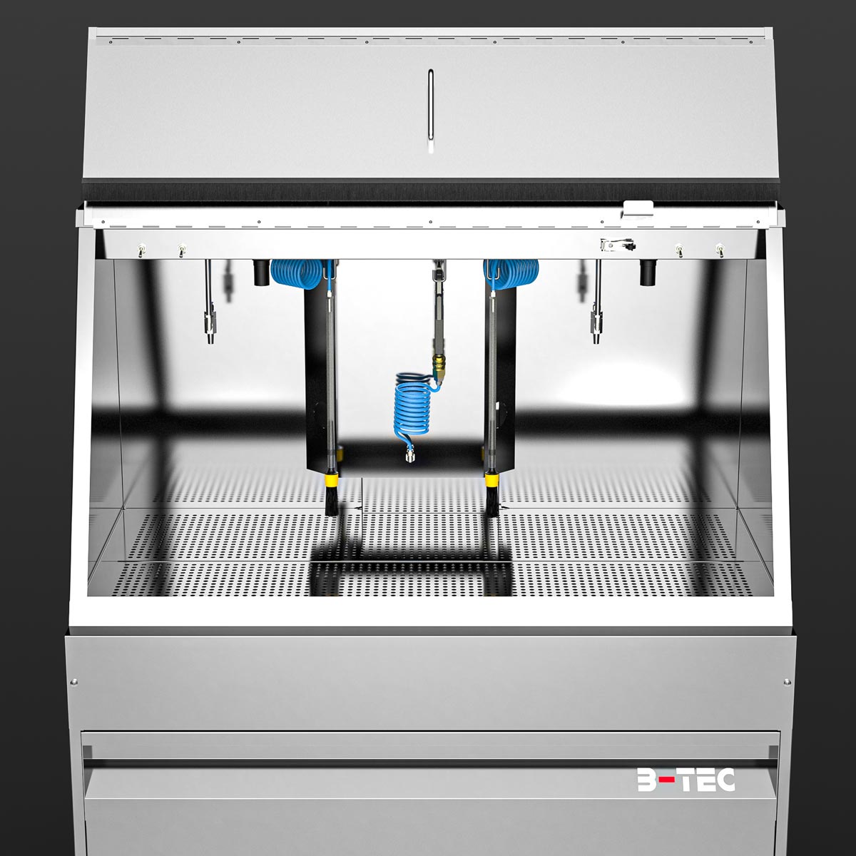 With a width of 1210 mm, it enables convenient, ergonomic cleaning of parts up to 1200 mm and effectively protects the user from solvent vapours with the powerful B-TEC air extraction system.