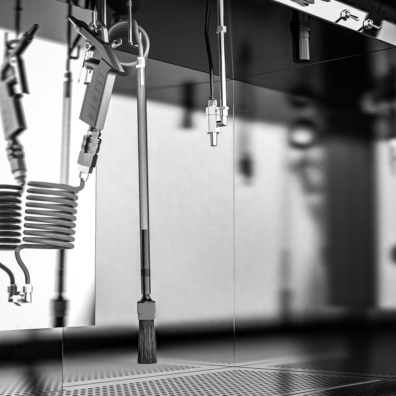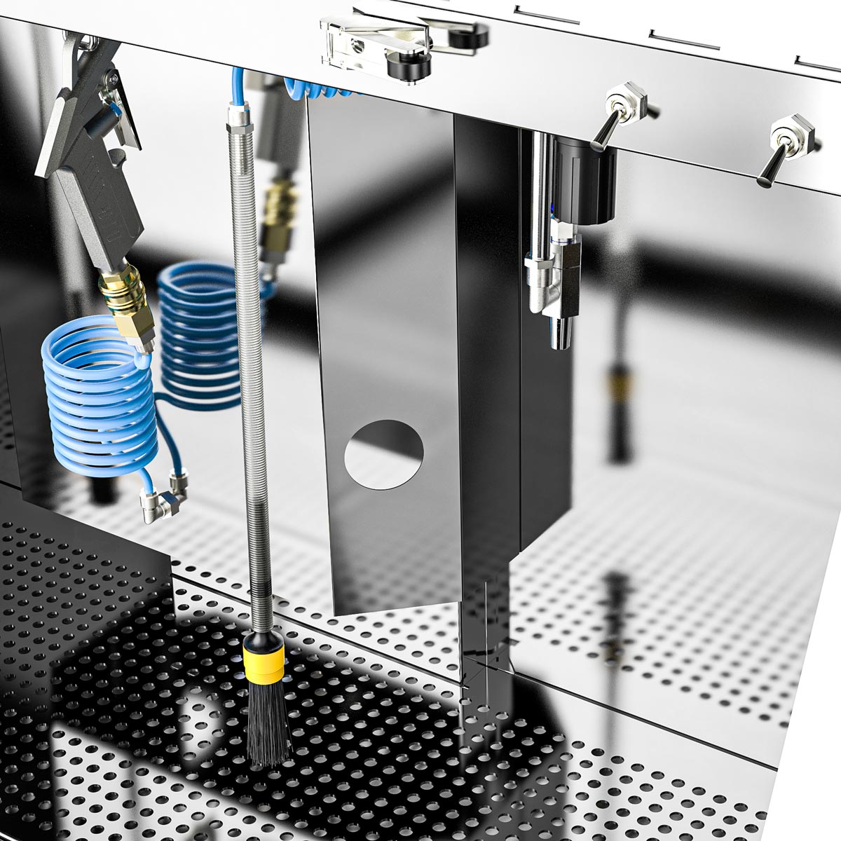 Completely made of stainless steel and optionally equipped with one (M-1200-1) or two (M-1200-2 for two users at the same time) adjustable flow-through brushes and fresh rinse nozzles, the unit is perfectly equipped to withstand daily use.