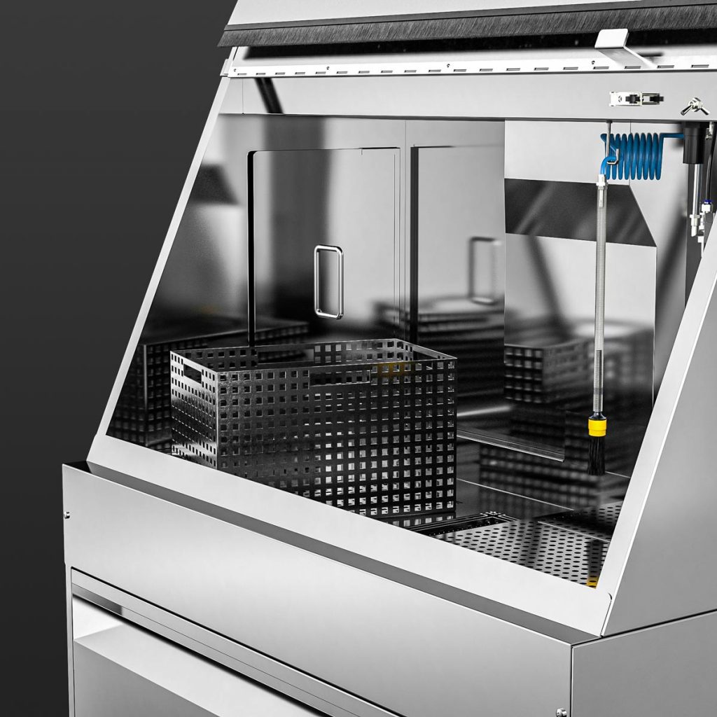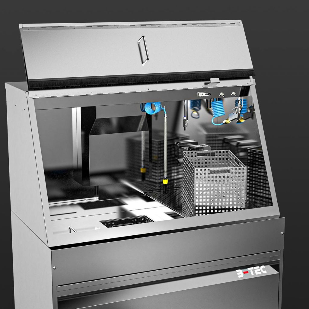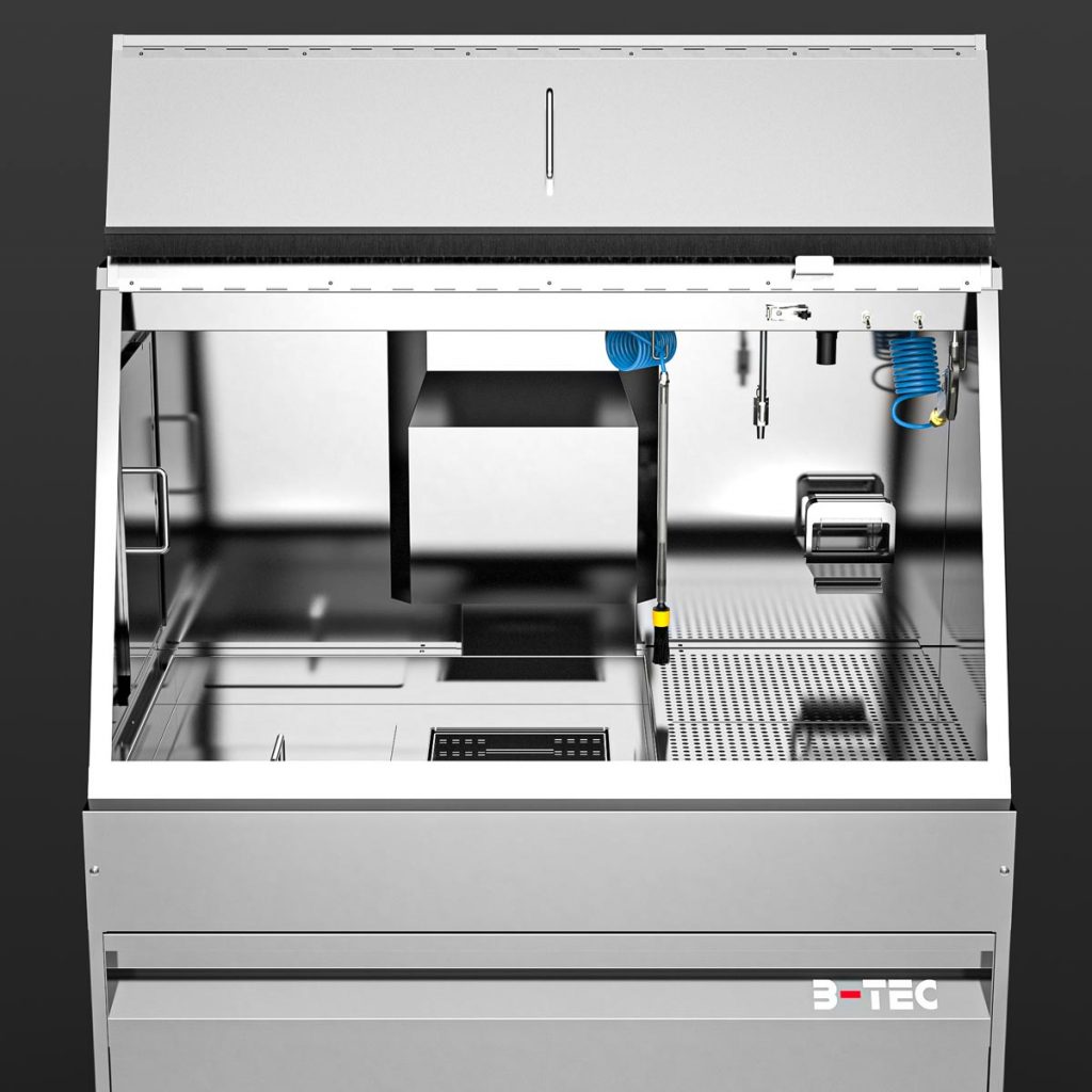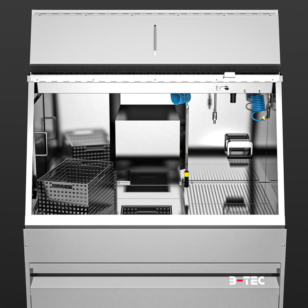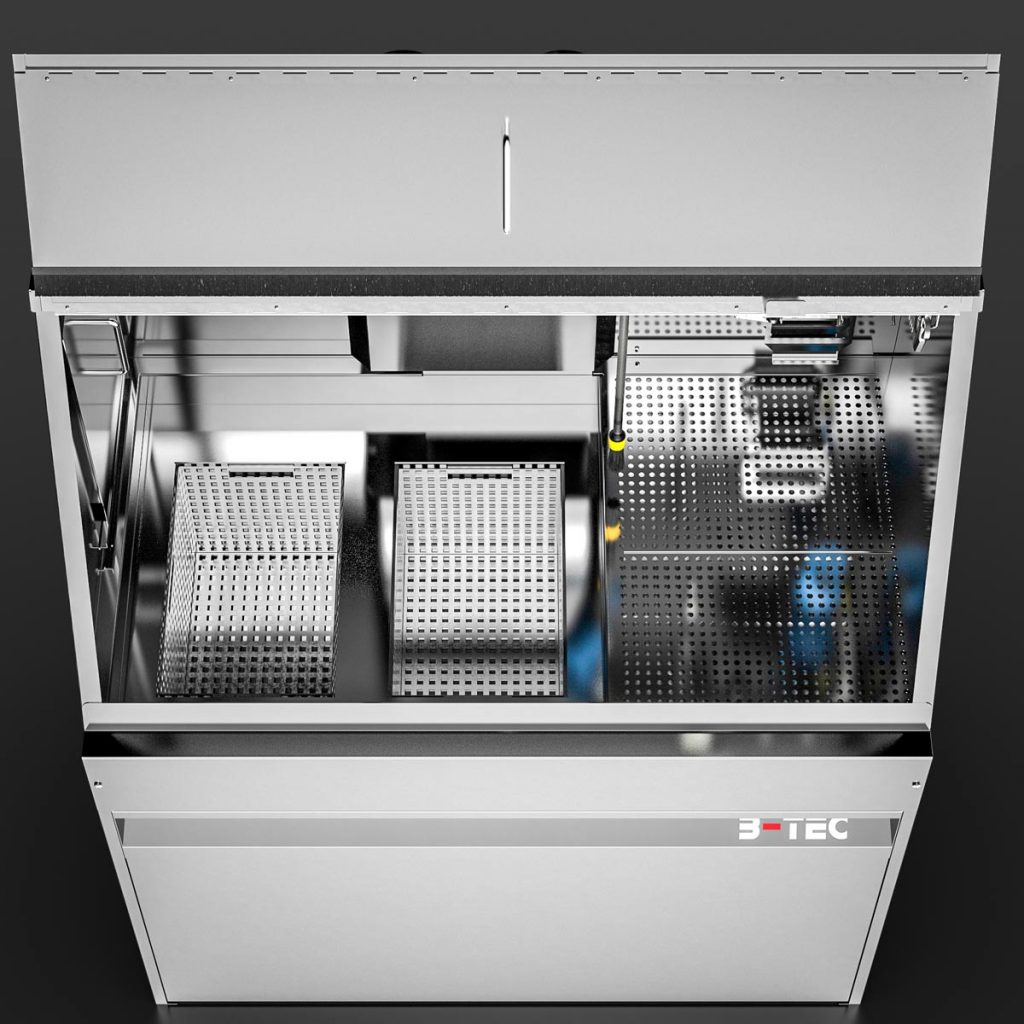 With the M-1200-TW, cleaning immersion is a breeze – even of large parts. Equipped as standard with two immersion tanks of 250 x 400 x 250 mm each as well as a spacious manual cleaning area with a pump-operated and pressure-adjustable flow-through brush, a fresh rinse nozzle for clean rinsing as well as a blow-off gun, manual cleaning of heavily soiled parts is a pleasure. Certainly equipped with the powerful B-TEC air extraction system and its ergonomic design, the user is excellently protected.