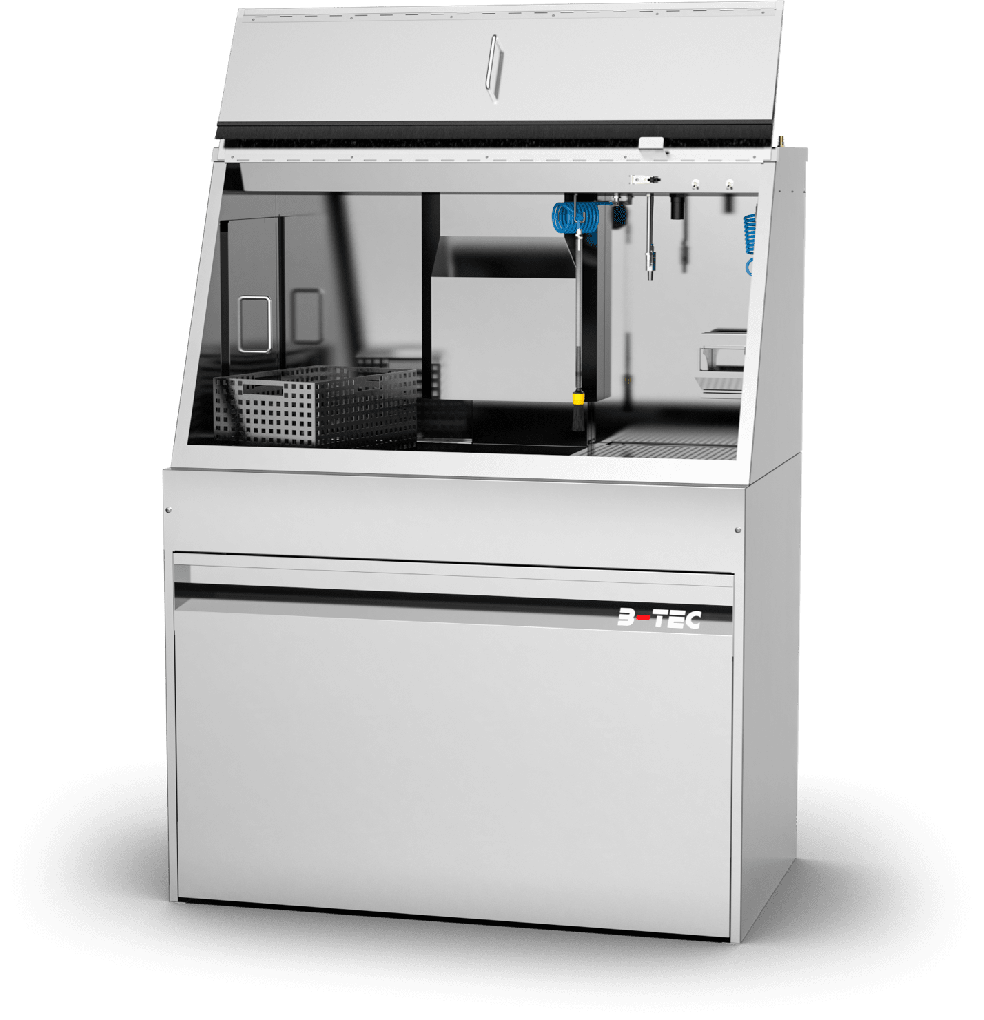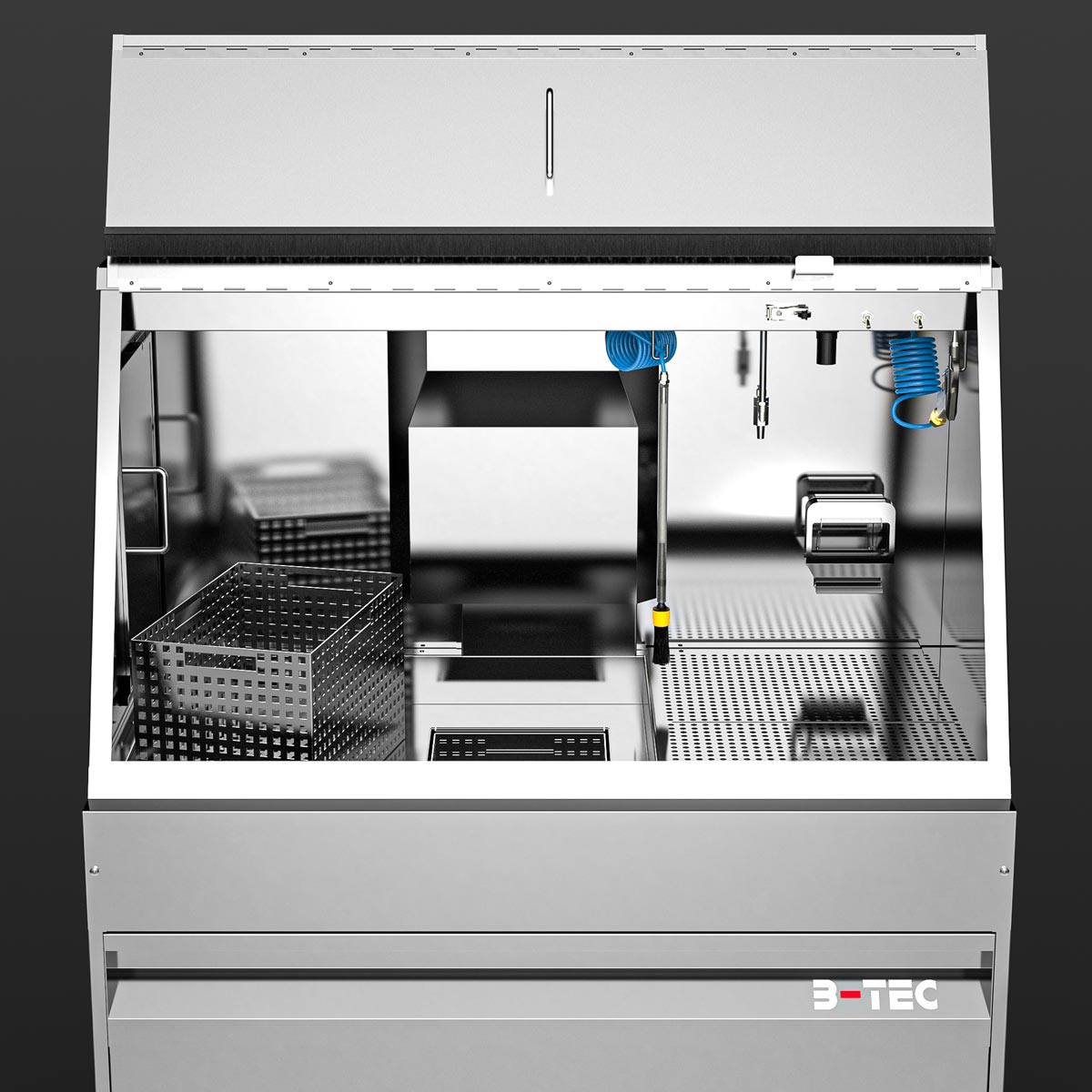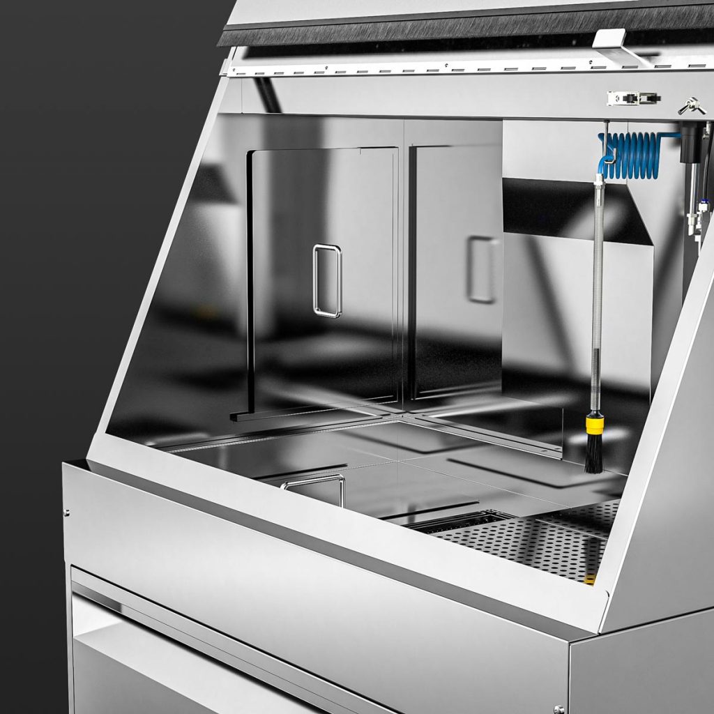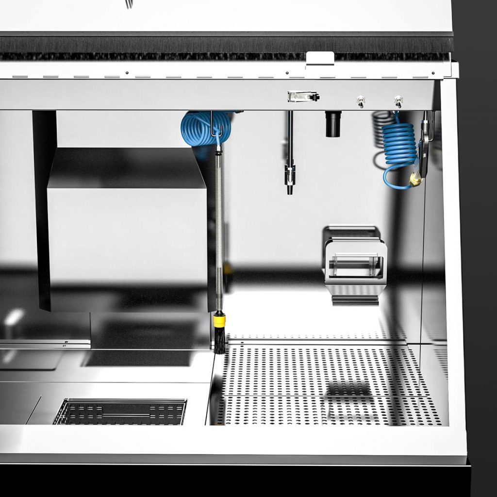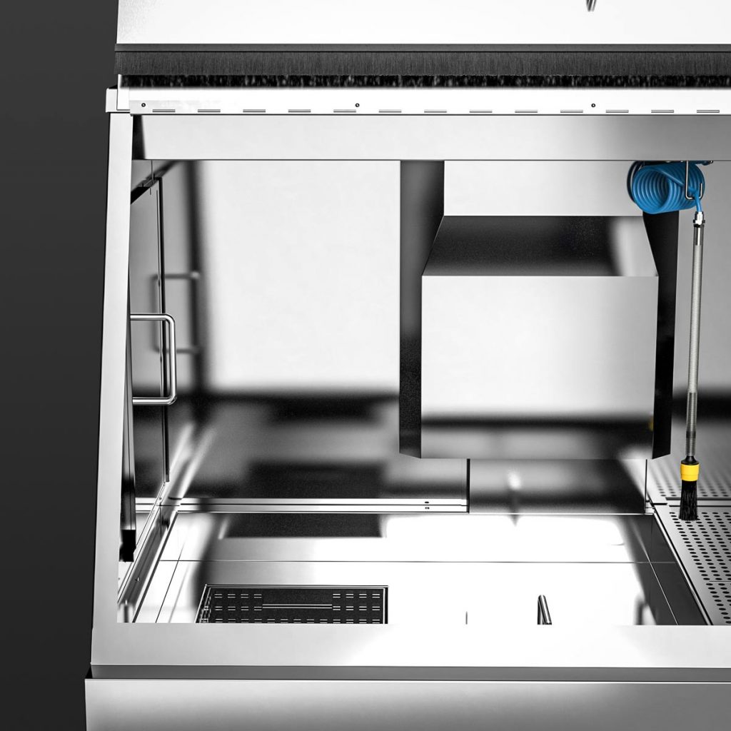 With the M-1200-TW, cleaning immersion is a breeze – even of large parts. Equipped as standard with two immersion tanks of 250 x 400 x 250 mm each as well as a spacious manual cleaning area with a pump-operated and pressure-adjustable flow-through brush, a fresh rinse nozzle for clean rinsing as well as a blow-off gun, manual cleaning of heavily soiled parts is a pleasure. Certainly equipped with the powerful B-TEC air extraction system and its ergonomic design, the user is excellently protected.