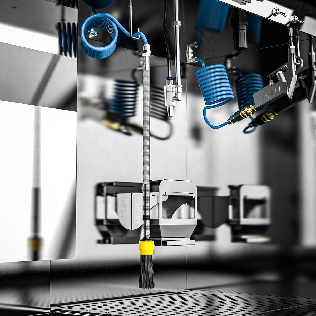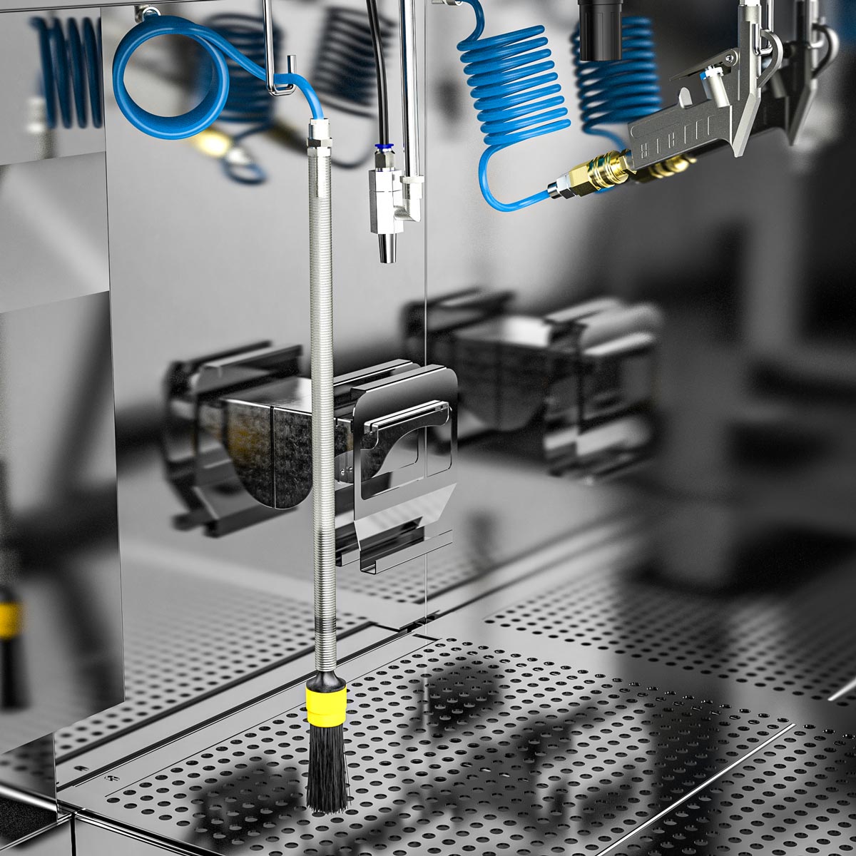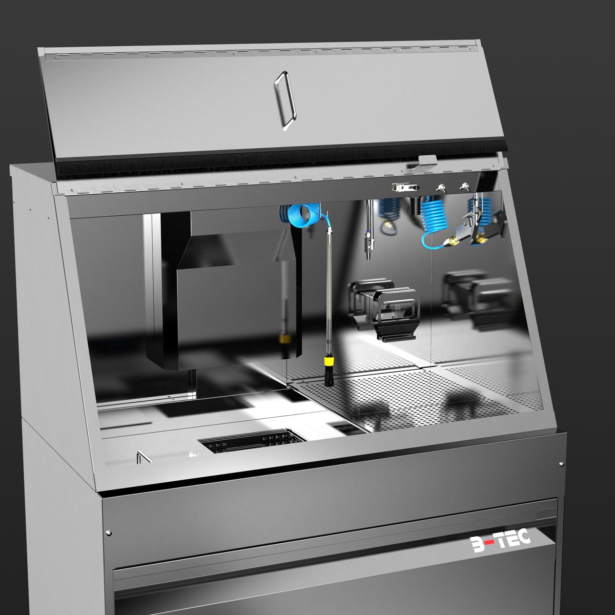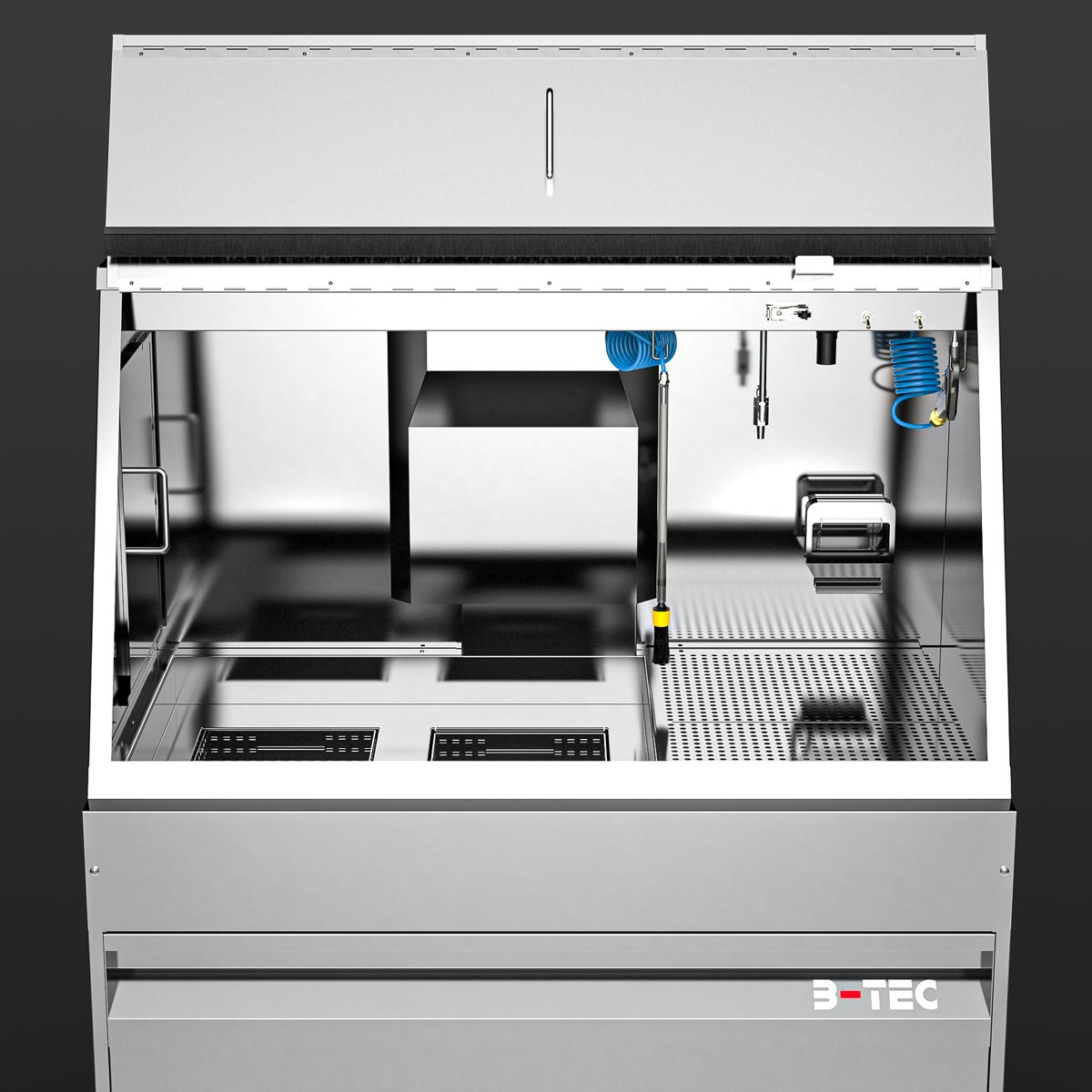 With the M-1200-TW, cleaning immersion is a breeze – even of large parts. Equipped as standard with two immersion tanks of 250 x 400 x 250 mm each as well as a spacious manual cleaning area with a pump-operated and pressure-adjustable flow-through brush, a fresh rinse nozzle for clean rinsing as well as a blow-off gun, manual cleaning of heavily soiled parts is a pleasure. Certainly equipped with the powerful B-TEC air extraction system and its ergonomic design, the user is excellently protected.