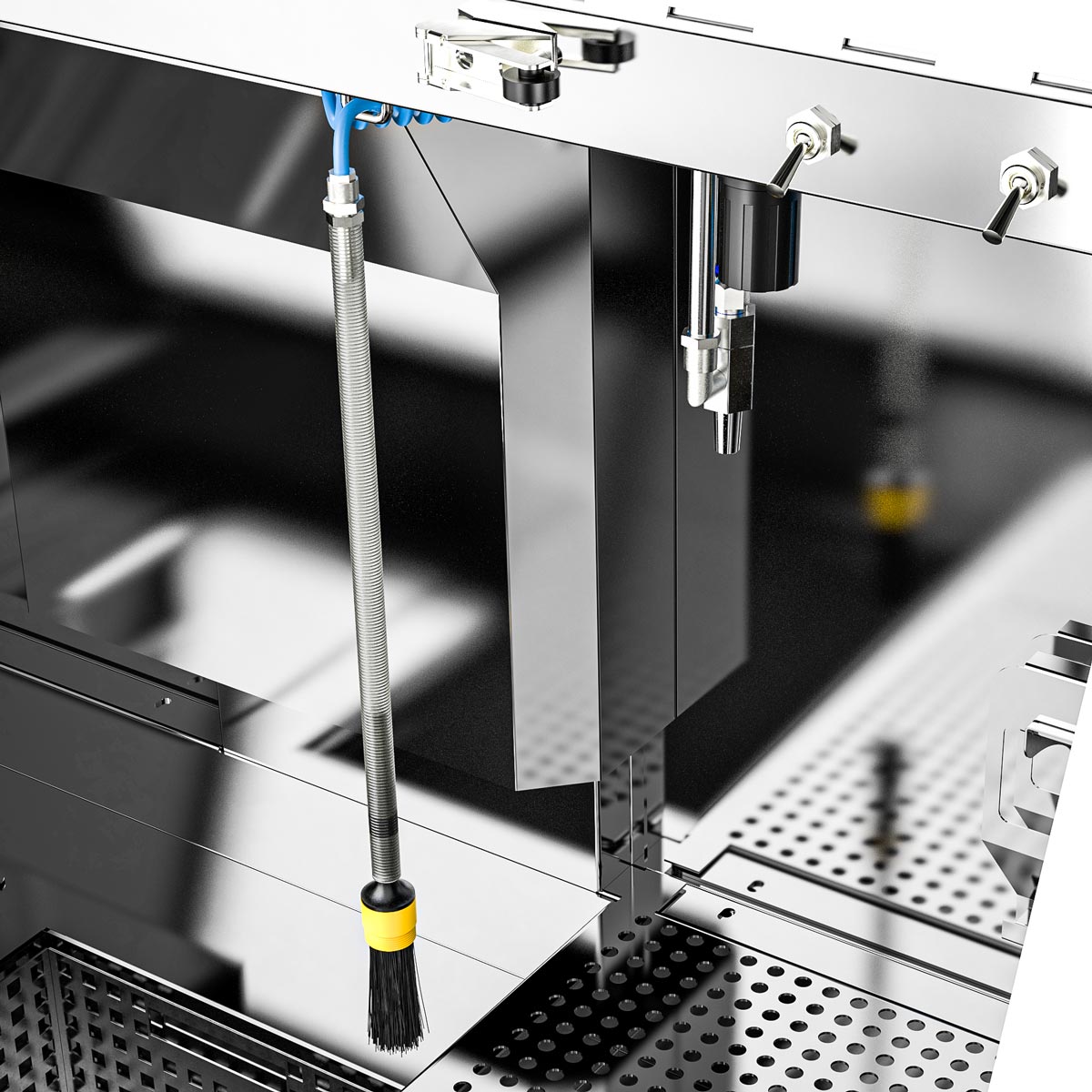 Bright cleaning chambers due to the utilization of stainless steel. No utilization of light absorbing plastic.