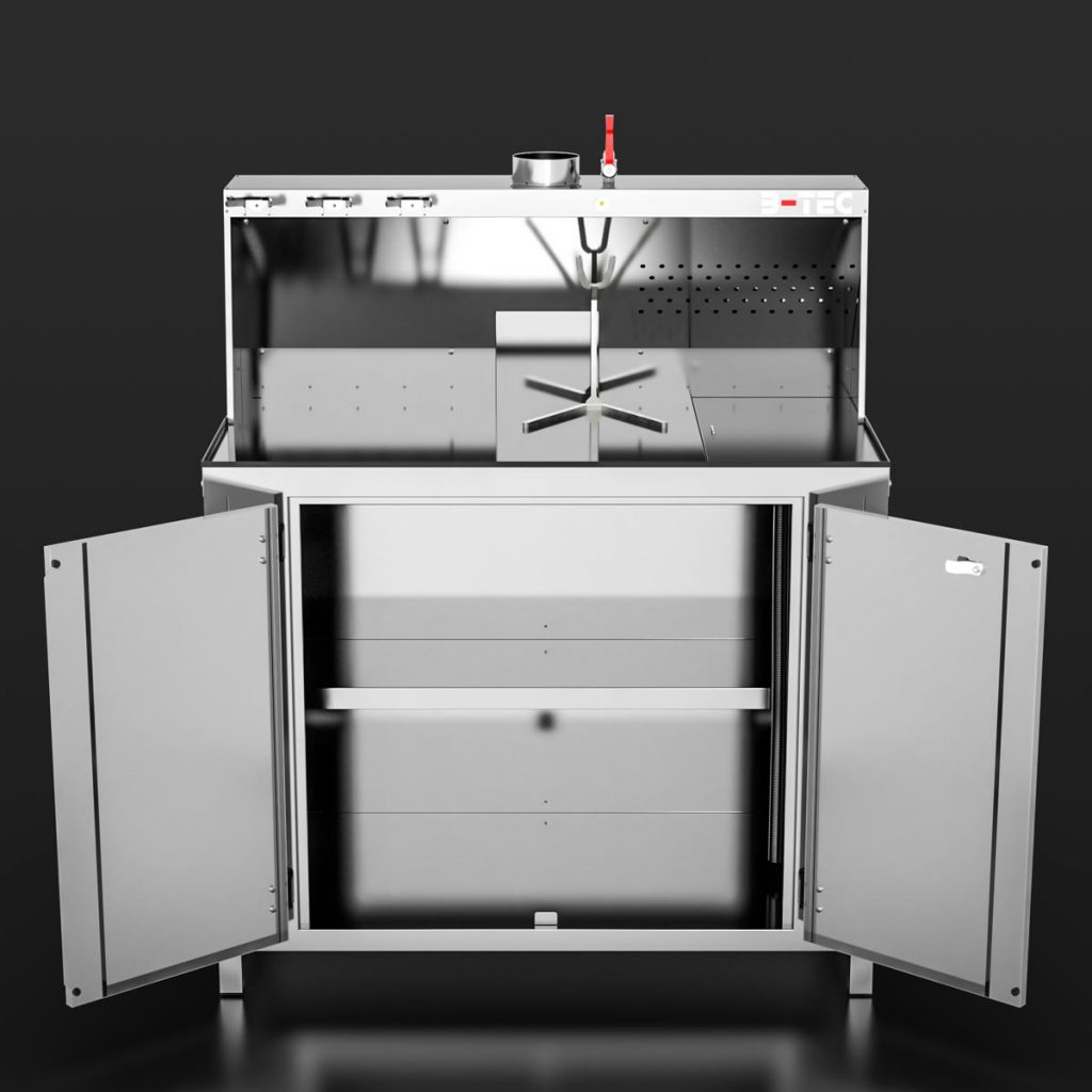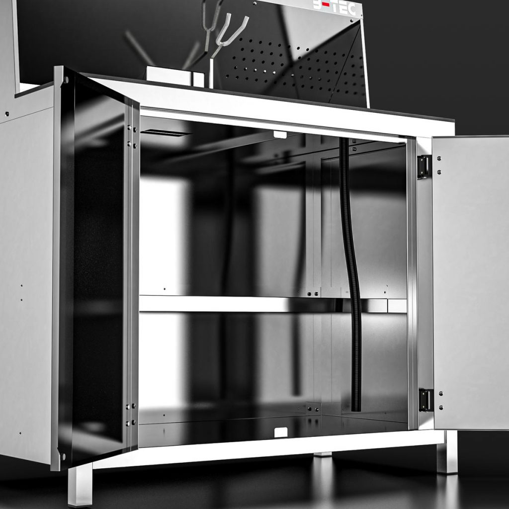 Thanks to the standard, powerful extraction system in the work area as well as in the base cabinet, annoying smells and harmful vapours are history when opening the base cabinet and/or while mixing the paint.