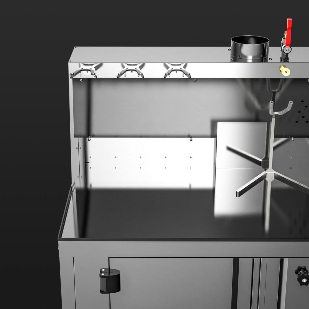 Mixing and preparation table with base cabinet including integrated extraction system.