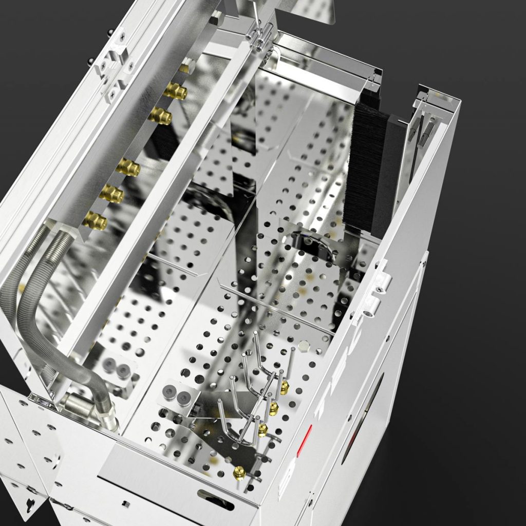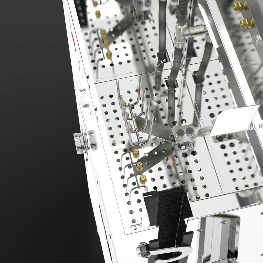 Bright cleaning chambers due to the utilization of stainless steel. No utilization of light absorbing plastic.
