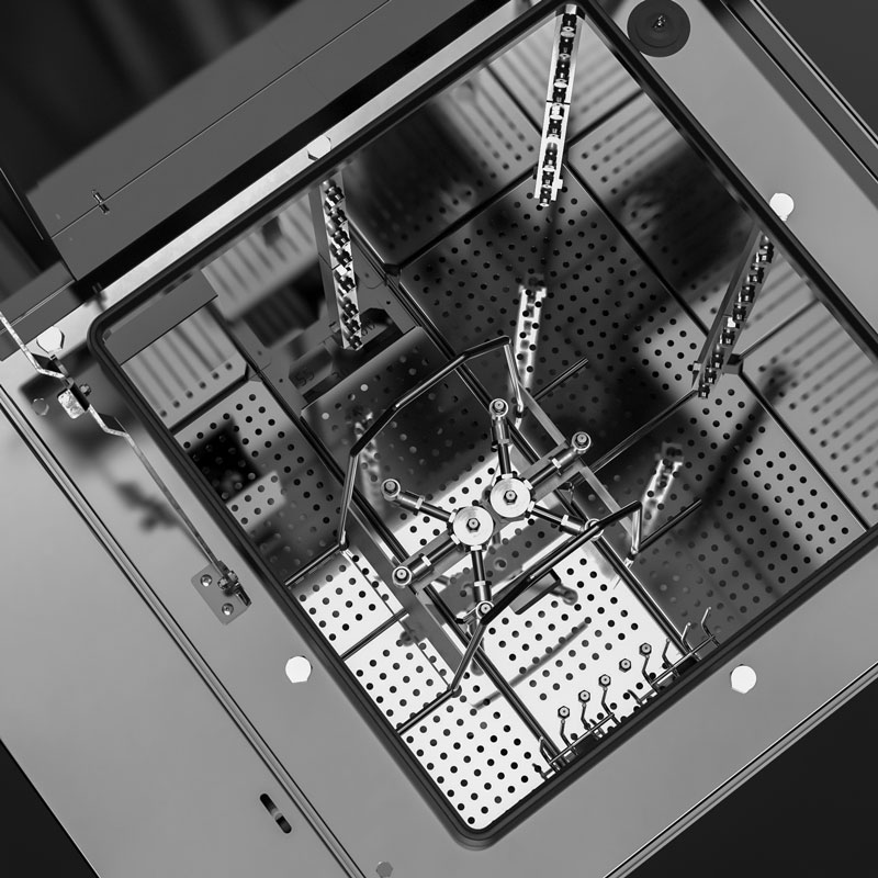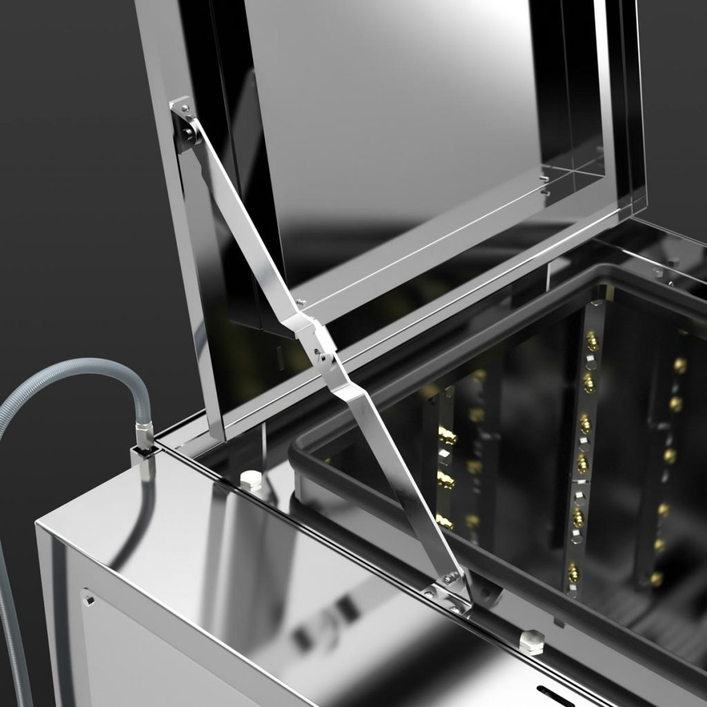 Bright cleaning chambers due to the utilization of stainless steel. No utilization of light absorbing plastic.