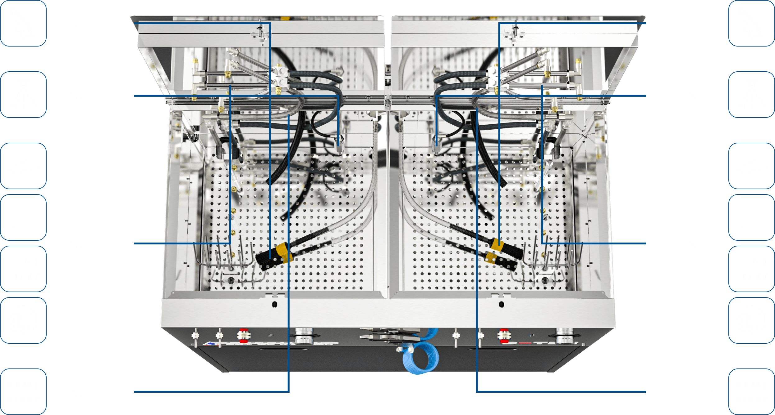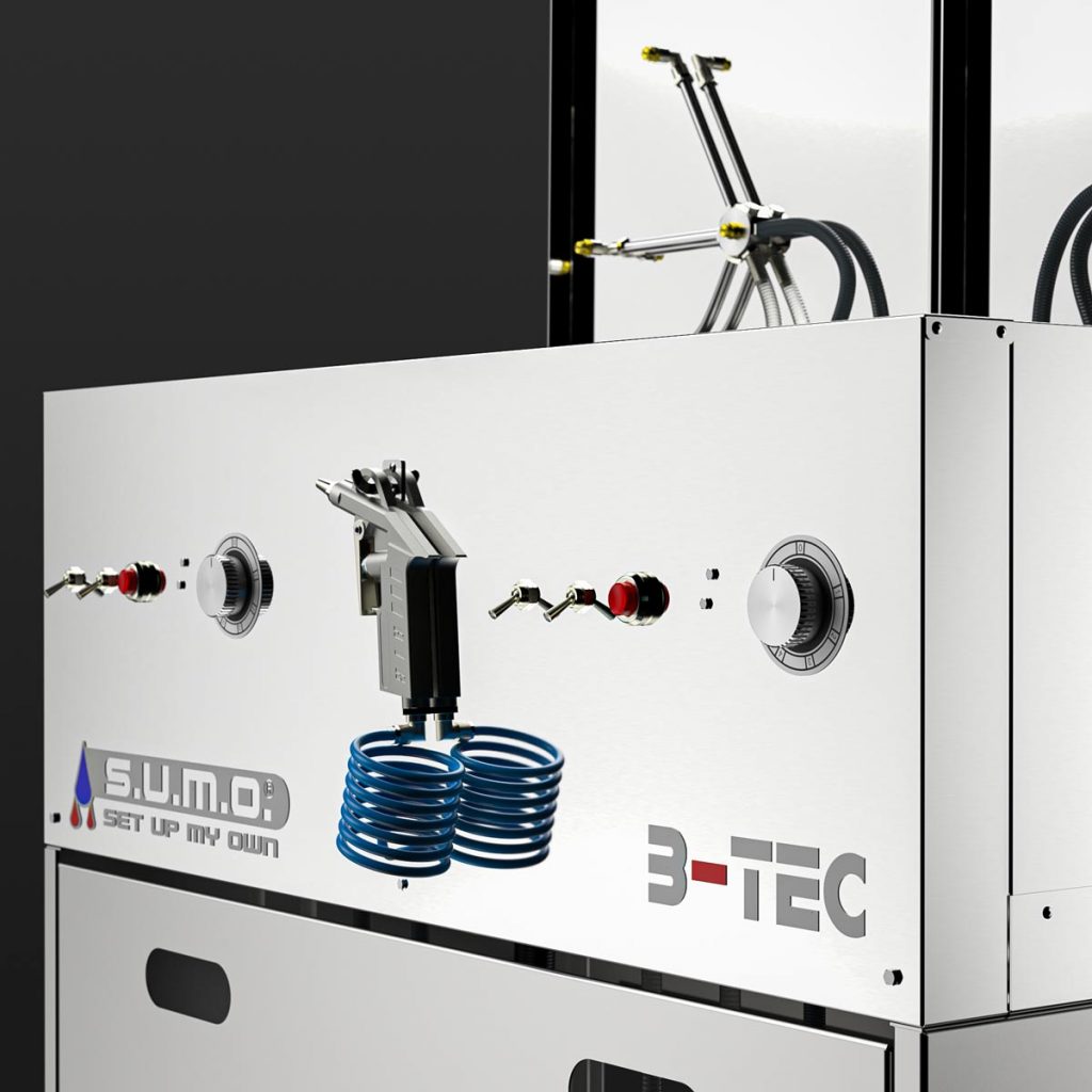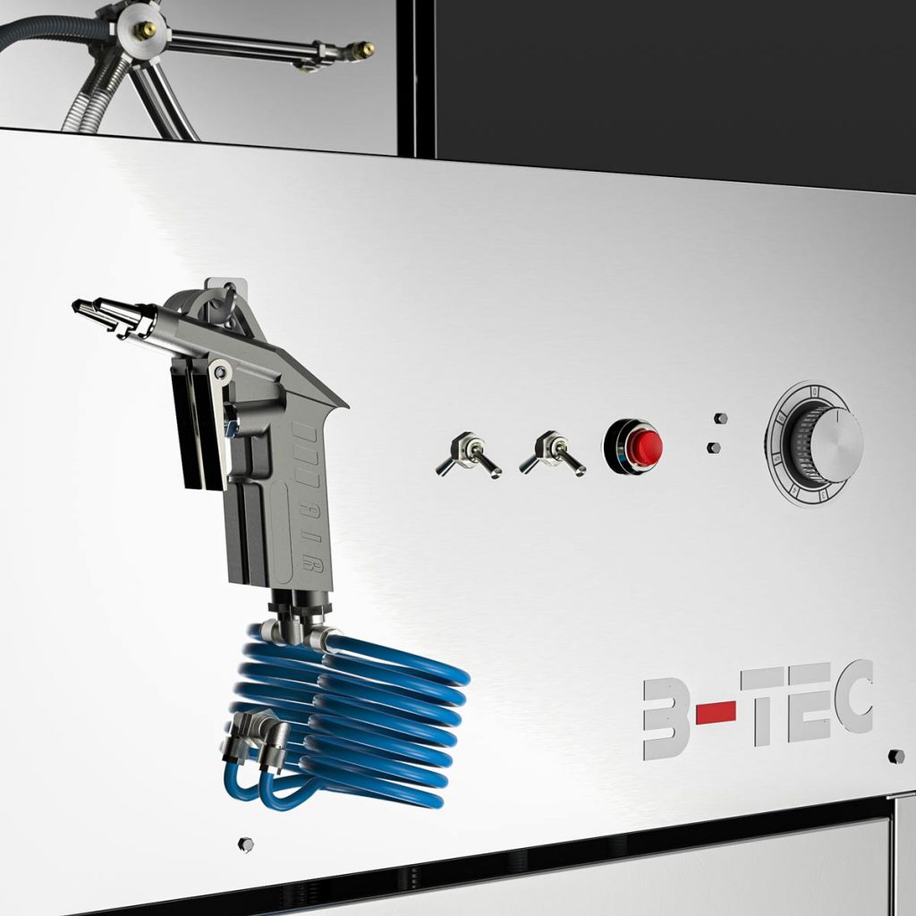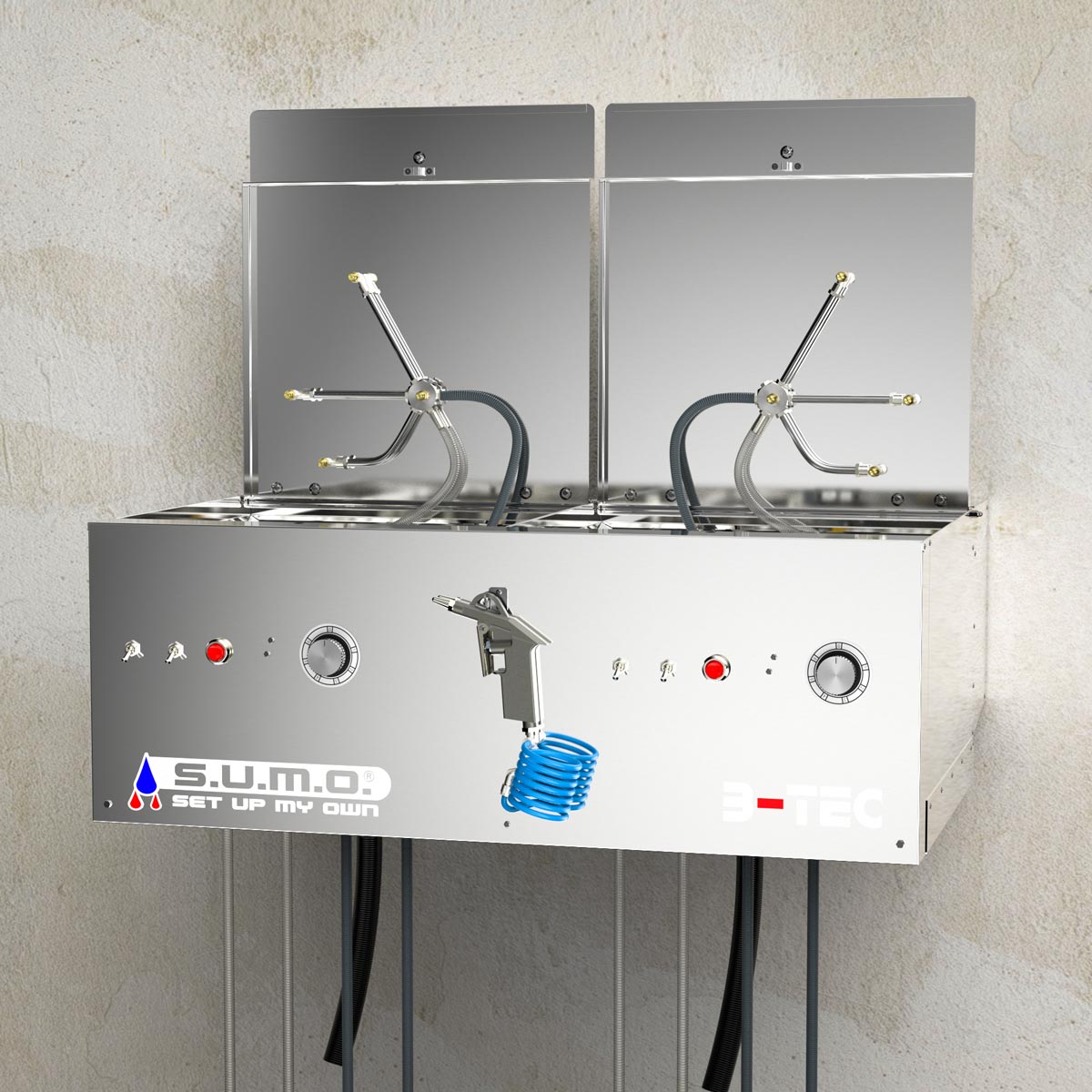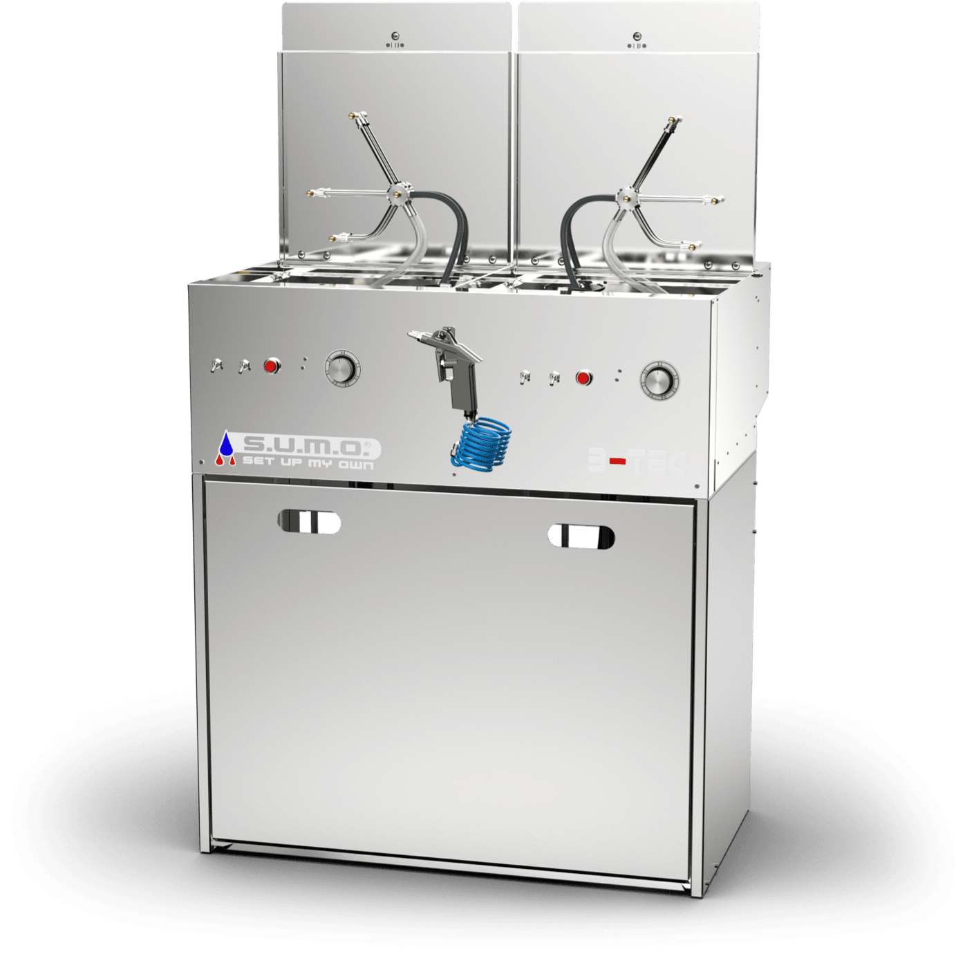 The basic module of the S.U.M.O. consists of two compact, independent cleaning rooms, includes the familiar powerful B-TEC extraction system for both sides of the machine and an universal blow-off gun.