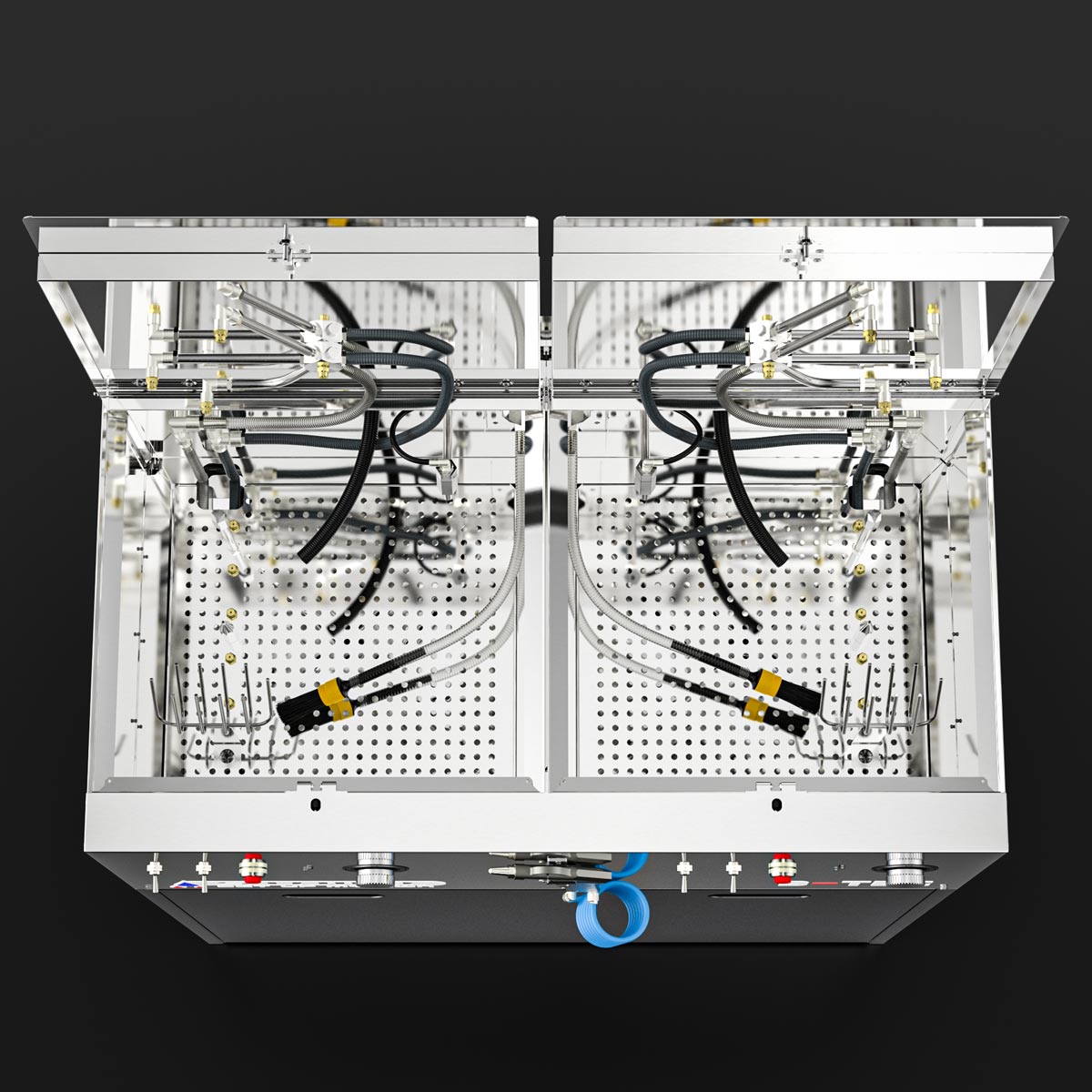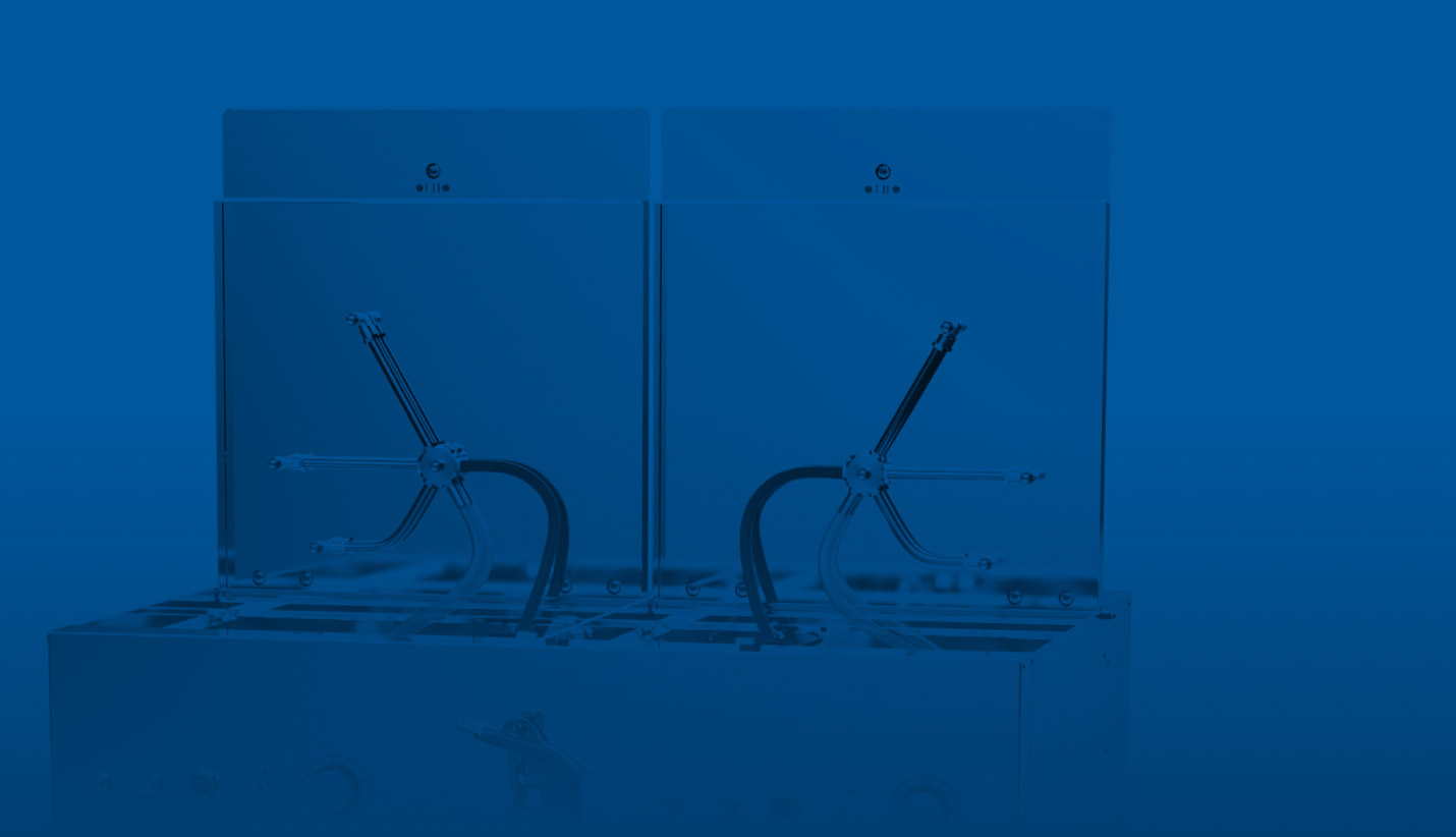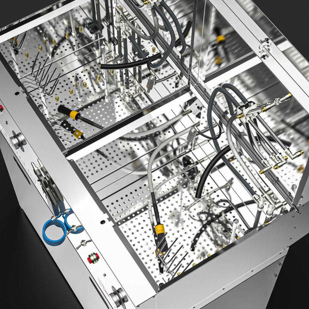 The washer is divided into two independent cleaning rooms, which can be used with solvent / B-TEC E2C, water-based cleaner or each with a different cleaning fluid.