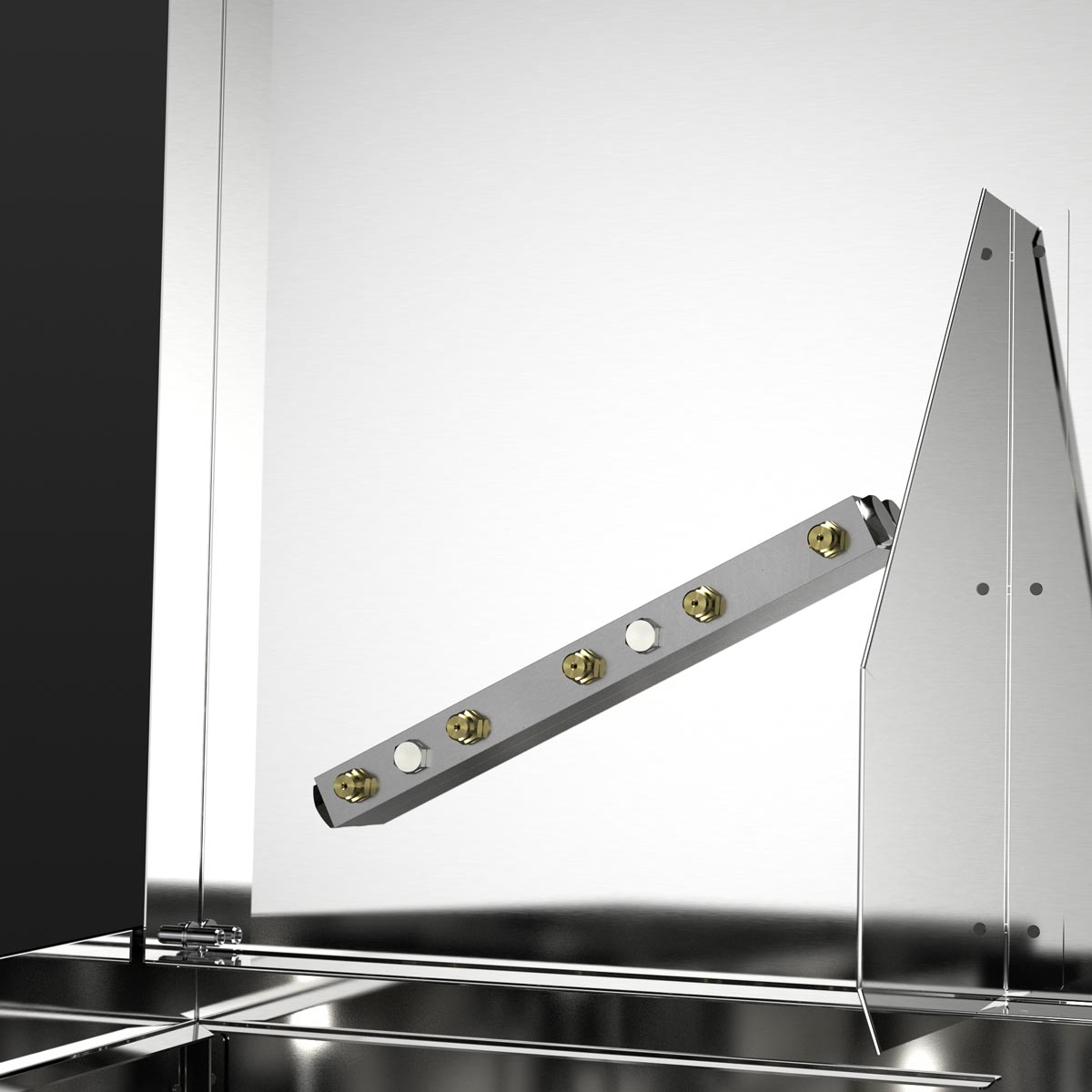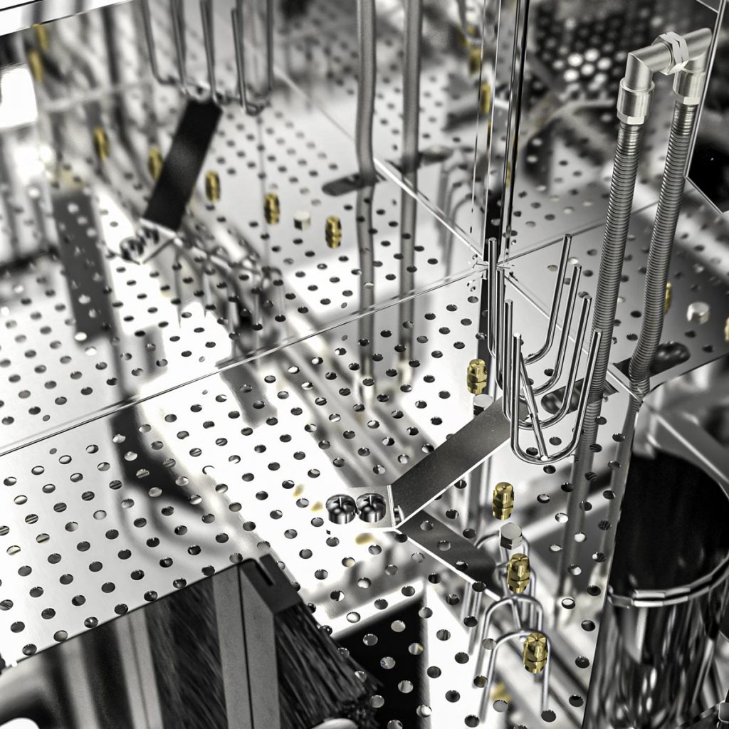 Cleaning area made of stainless steel, spray nozzles made of brass, base galvanised