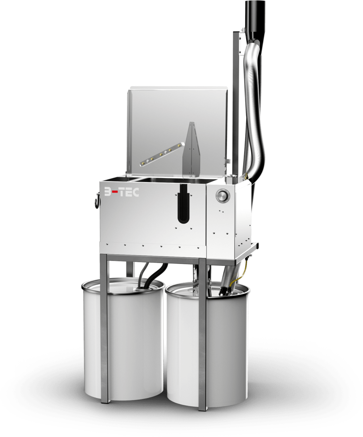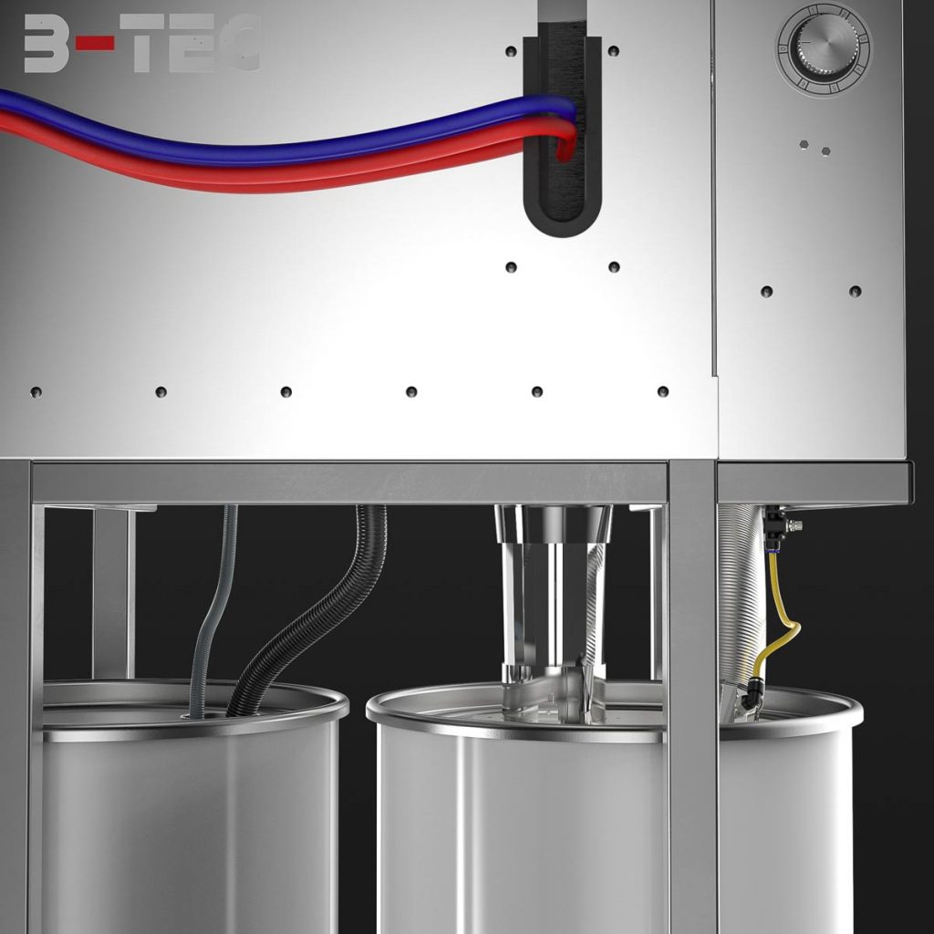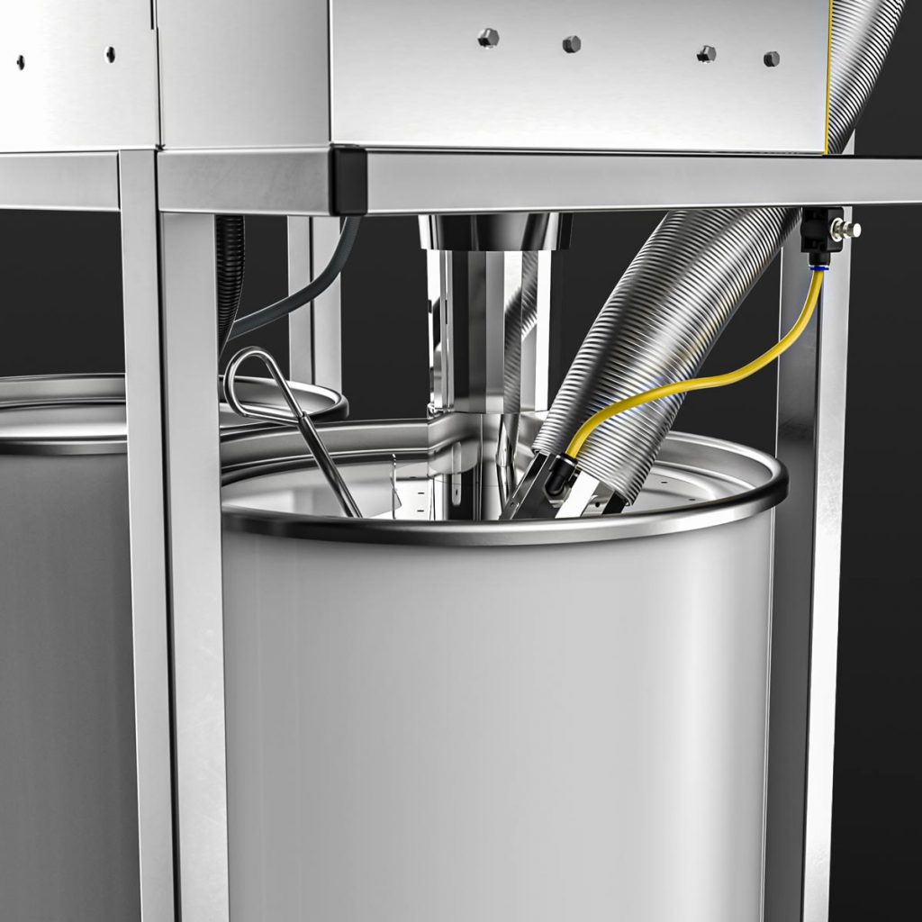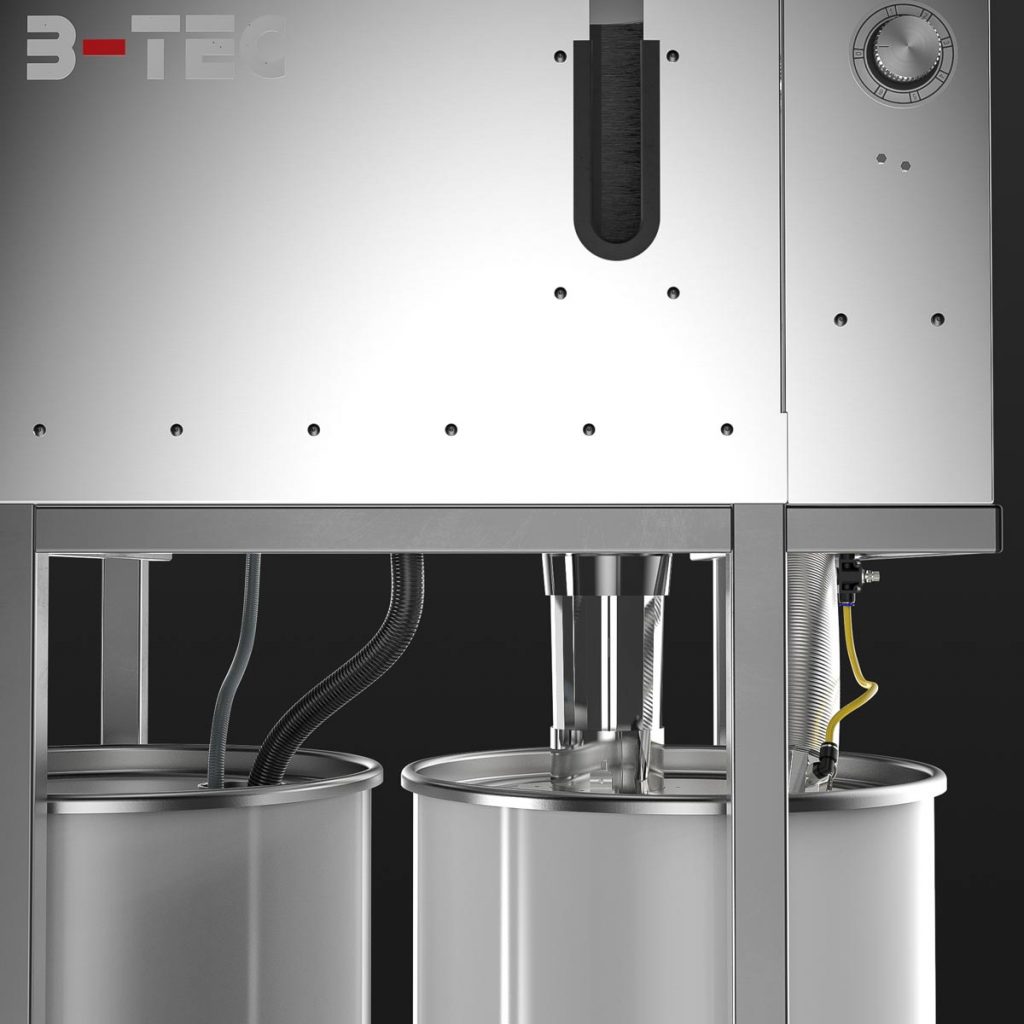 The material hoses are blown out and rinsed through while the suction system is running in the open unit – ATEX compliant and free of overspray.