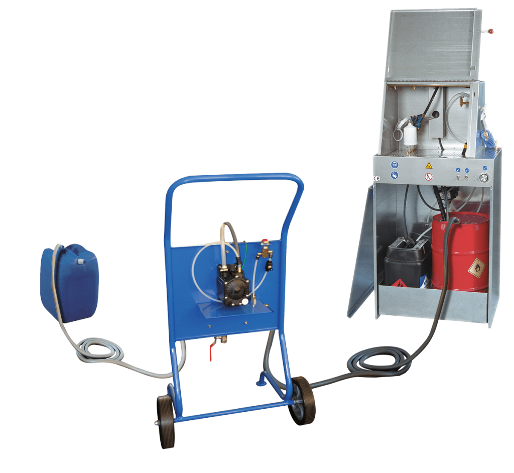 At the push of a button, the mobile STS-18 solvent transfer station pumps fresh as well as used fluids at up to 18 litres per minute from one container to the next – versatile and mobile.